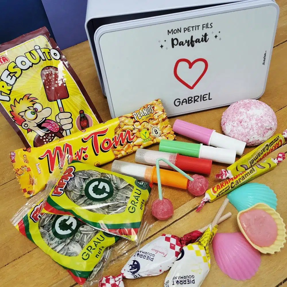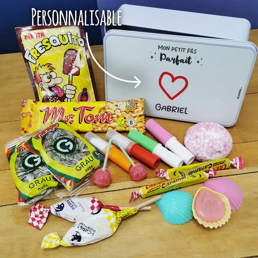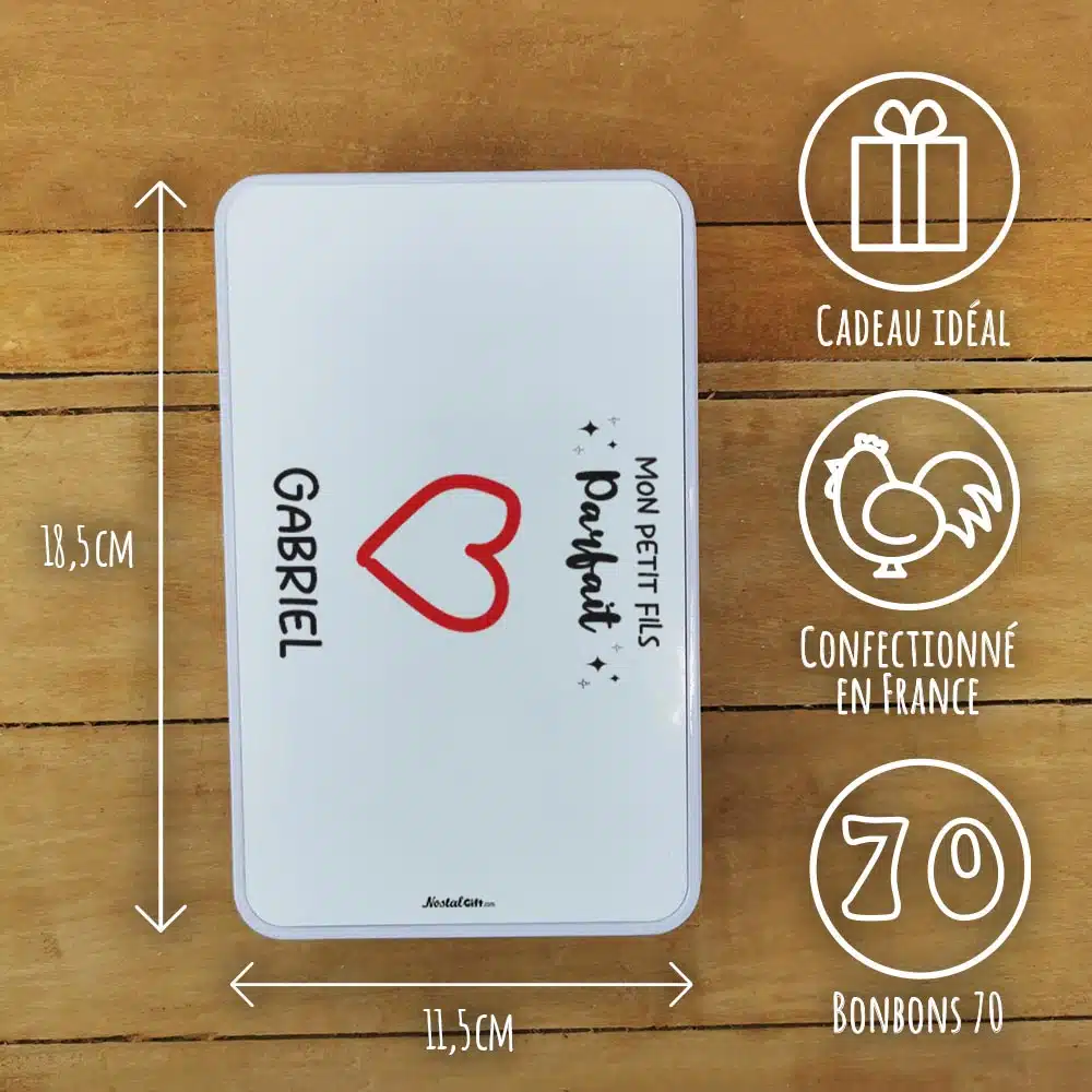Bonbons des années 70 “Mon petit fils parfait” (Boîte en metal) – cadeau personnalisé
