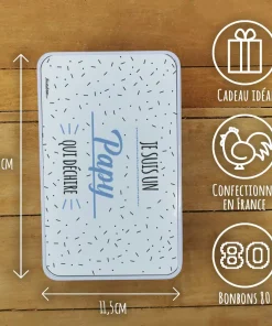 Un cadeau parfait pour la Fête des grands pères, Noël ou un anniversaire, où retrouver les saveurs d’antan avec les confiseries. La boîte est réutilisable, et parfaite pour stocker les petits souvenirs.