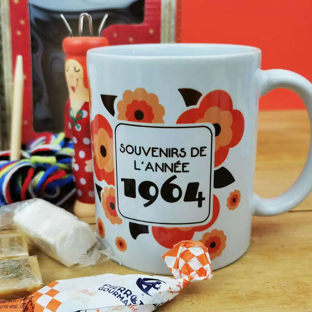 - Un mug personnalisé en céramique au design rétro “souvenirs des années 60” où vous pouvez préciser l’année exacte que vous souhaitez