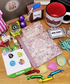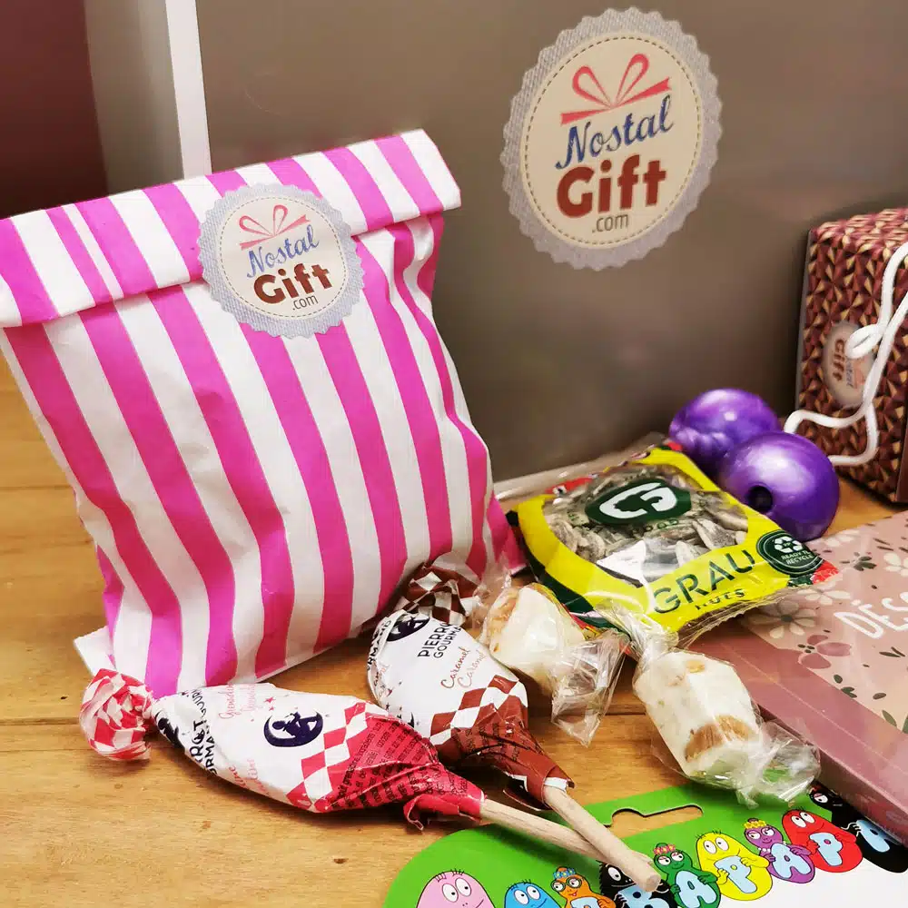 - Un sachet de bonbons avec des 2 nougats, 3 roudoudous, 4 mini sucre d’orge aux fruits, 1 sachet de Pipas, et 2 sucettes Pierrot Gourmands