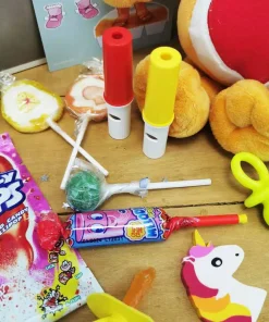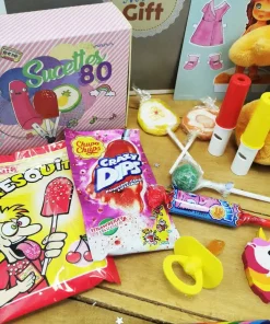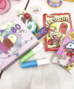 – Une boîte sucette des années 80 (avec Fresquito, Melody pop, sifflet dextrose, sucette rock, Crazy dipp, sucette tâche langue)