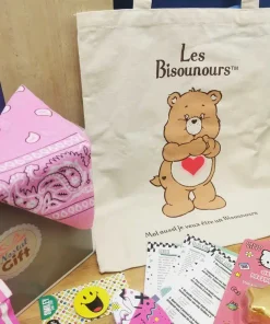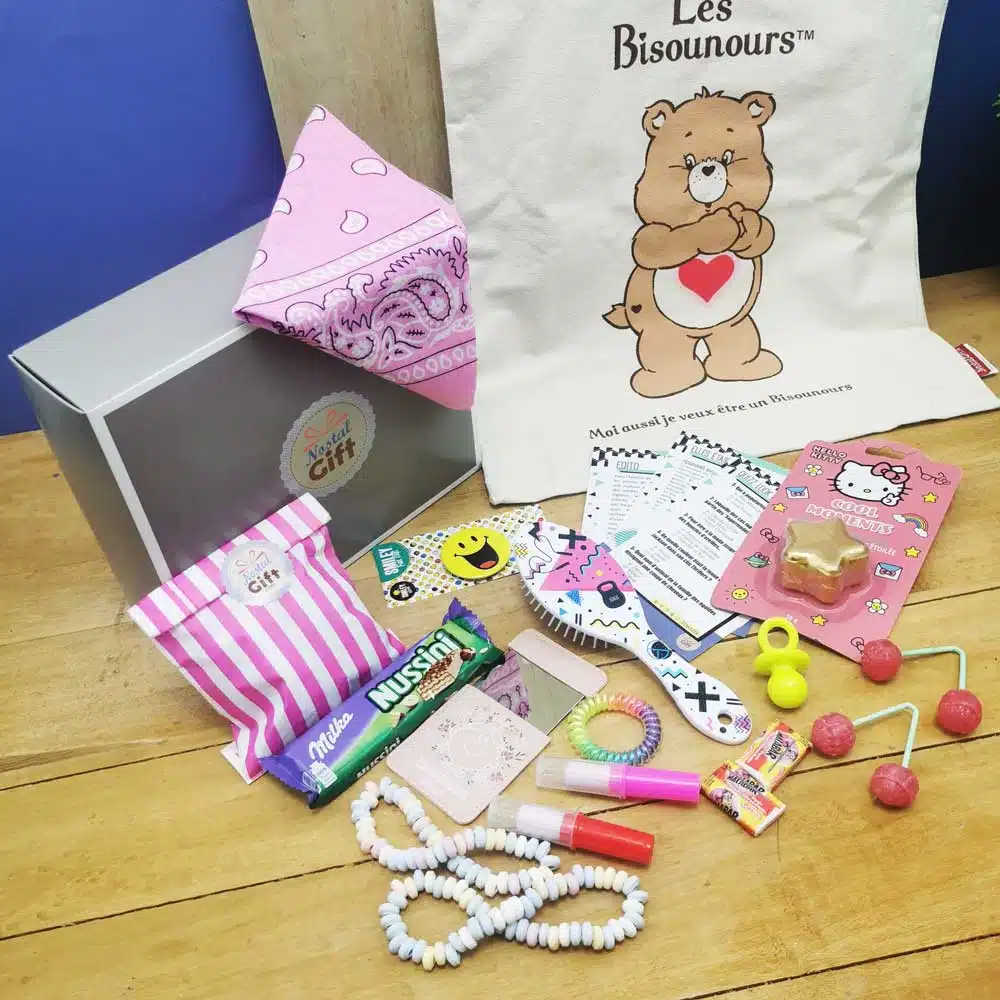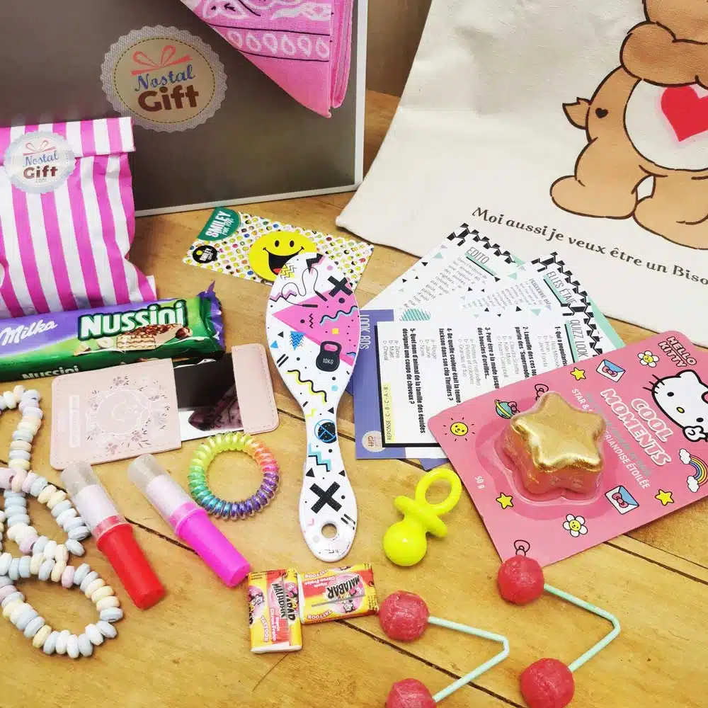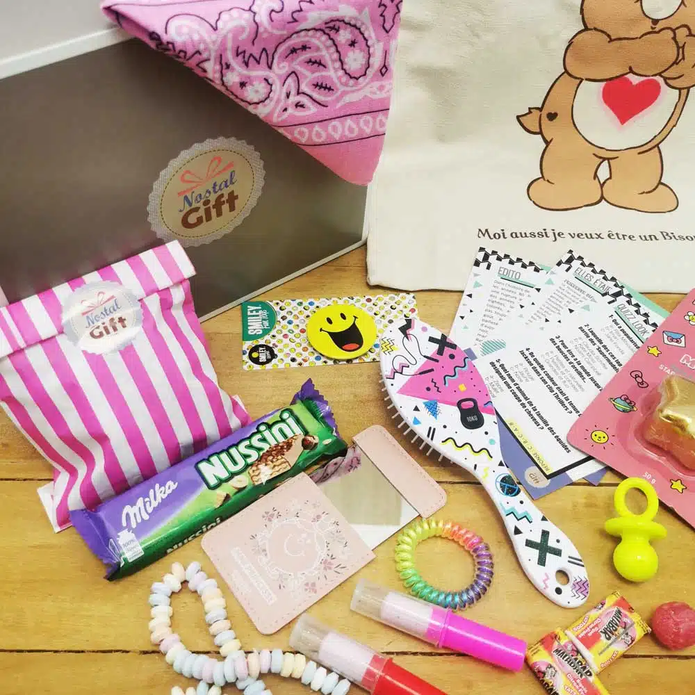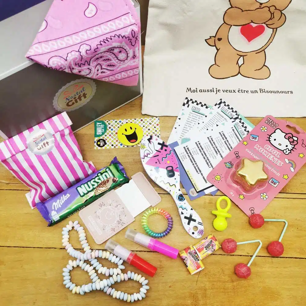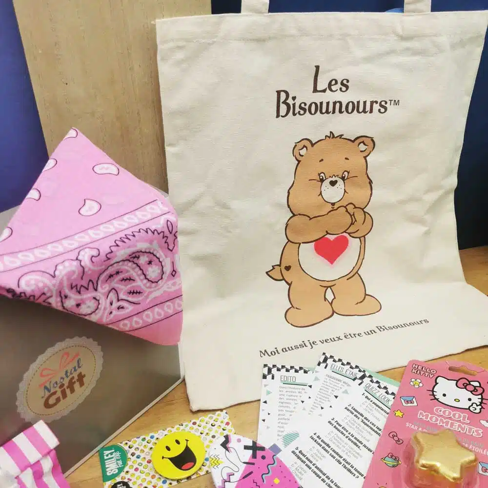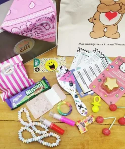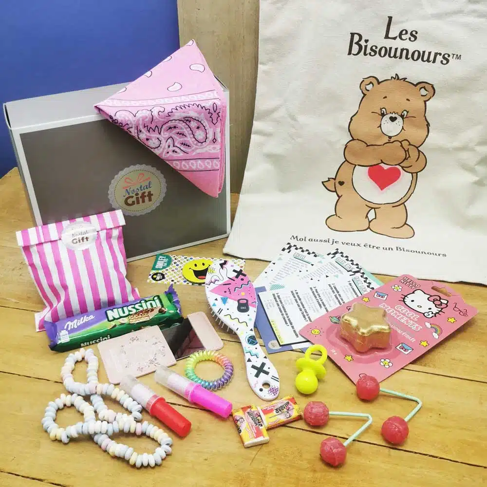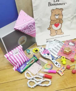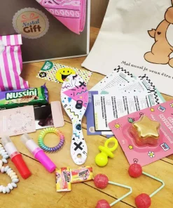 Découvrez dans ce coffret cadeau les produits phares pour avoir un style “so 80’s”. Replongez à l’époque du collège avec un bandana, un magnifique Tote Bag Bisounours une bombe de bain Hello Kitty (licence officielle), une brosse à cheveu 80s, un élastique/bracelet ressort arc-en-ciel, un miroir de poche Monsieur Madame, une totoche géante, un badge Smiley et bien sûr, des friandises des années 80 !