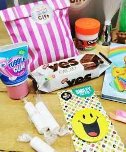 10 – Un sachet de bonbons avec : 2 roudoudous , 3 pailles, 1 chewing-gum en tube “tubble gum” et 3 Fizzy roll et un gâteau Yes