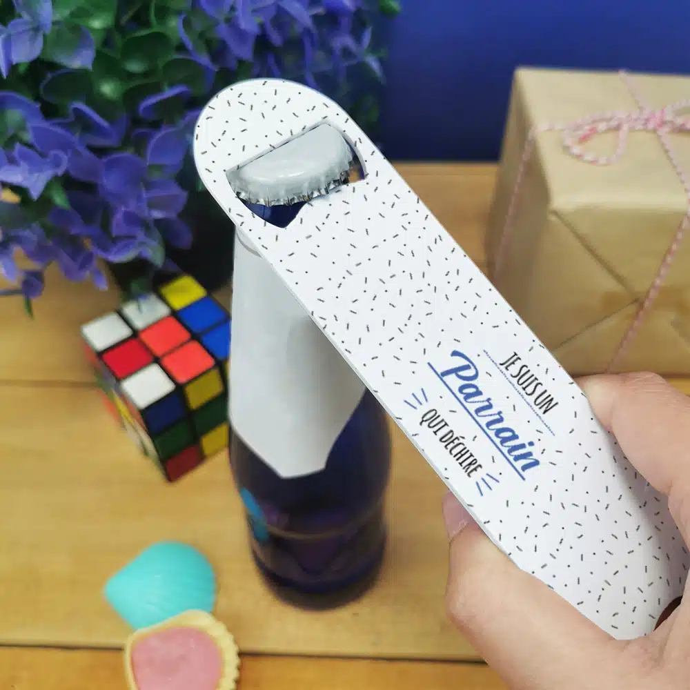 Vous ne savez pas quoi offrir à votre parrain qui déchire ? Optez pour ce superbe décapsuleur qui lui servira quotidiennement, c’est un cadeau original avec un beau message ! Pour son anniversaire ou pour n’importe quelle occasion cette petite attention lui fera plaisir à coup sur !