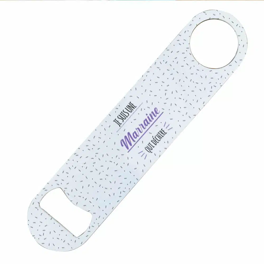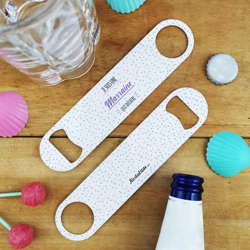 Vous ne savez pas quoi offrir à votre marraine qui déchire ? Optez pour ce superbe décapsuleur qui lui servira quotidiennement, c’est un cadeau original avec un beau message ! Pour son anniversaire ou pour n’importe quelle occasion cette petite attention lui fera plaisir à coup sur !