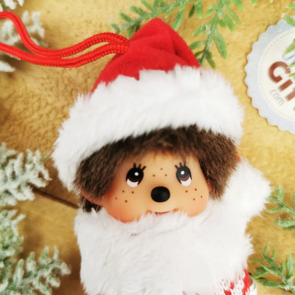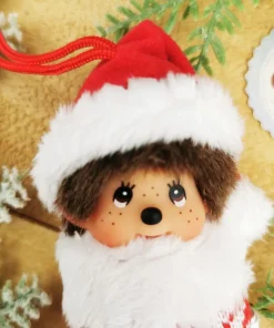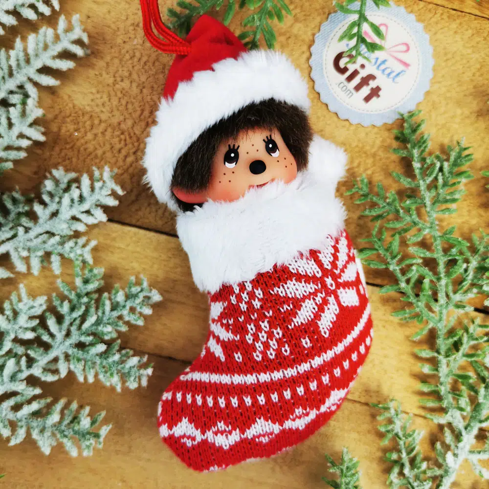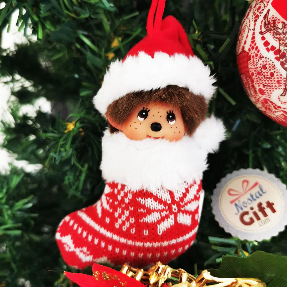 Décoration de Noël Monchhichi Kiki – Chaussette rouge (Père Noël) – 12cm