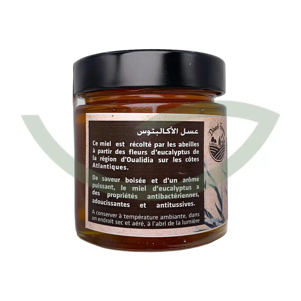 L‘eucalyptus, également connu sous le nom d’eucalyptus d’Oualidia, est produit dans la province d’Oualidia au Maroc. L‘eucalyptus a de nombreux avantages en plus de son goût sucré et délicieux. Ce sont ses atouts Le miel hérite de son arbre originel : l’Eucalyptus. Son nectar est connu pour lutter contre les infections respiratoires : asthme, tuberculose, bronchite, etc. Il soulage la toux, les maux de gorge et prévient les rhumes. De même, le miel d’eucalyptus est un antiseptique intestinal et urinaire, antispasmodique et vermifuge. Une cuillerée de ce miel unique peut aider à soulager les maux d’estomac tels que les ballonnements, les vomissements ou l’indigestion.