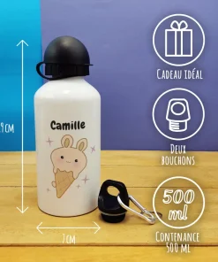 Gourde personnalisée enfant Glaces Kawaii – Cadeau pour fille, parfait pour la rentrée scolaire ou fêter un anniversaire – 2 bouchons dont bouchon mousqueton