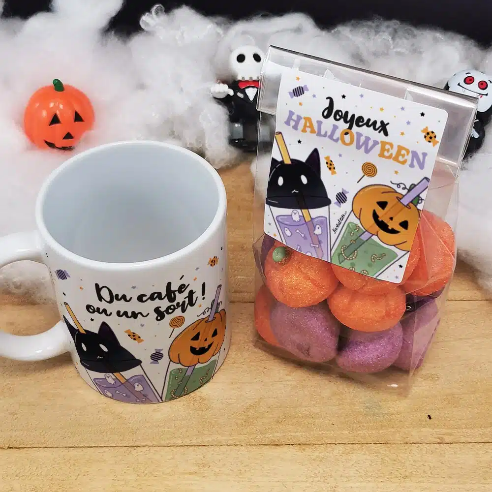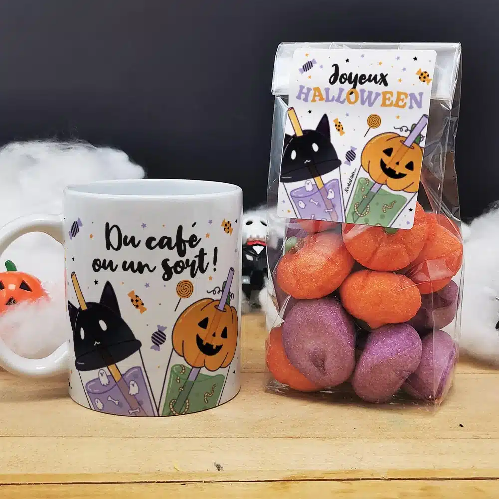 Halloween – Mug Bubble tea “Du café ou un sort” + 15 guimauves Tête de mort