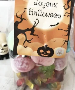 –Contient : 15 guimauves citrouilles/tête de mort (orange et violet)