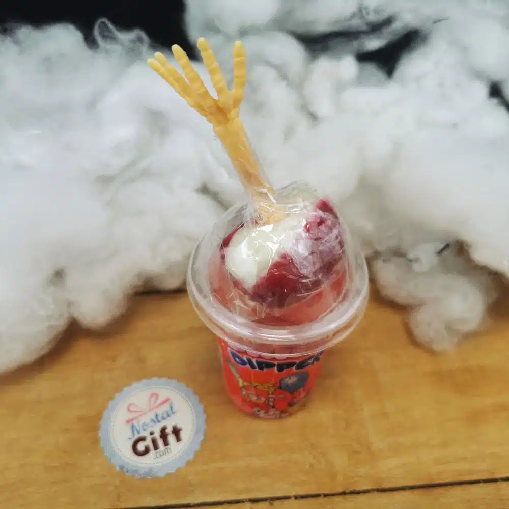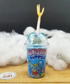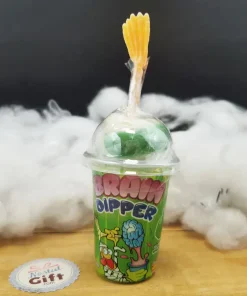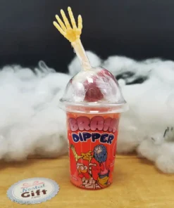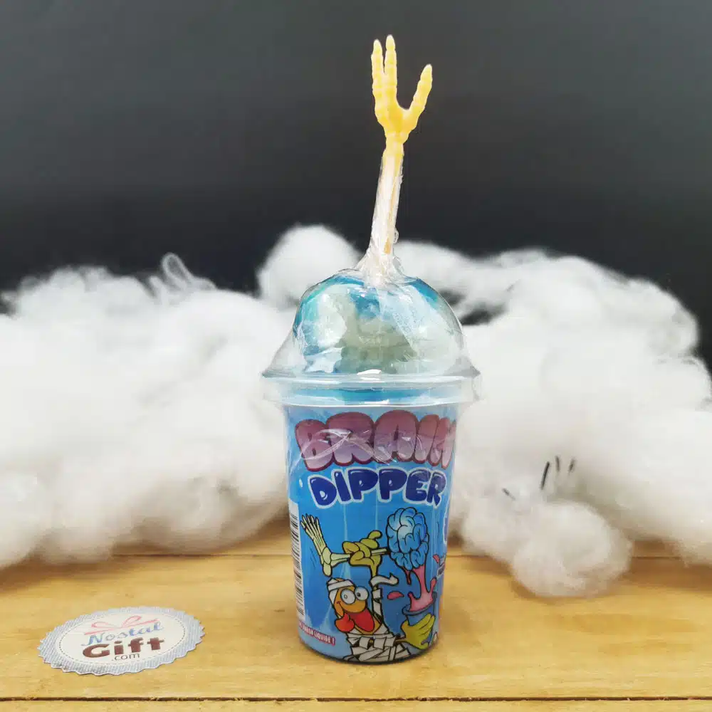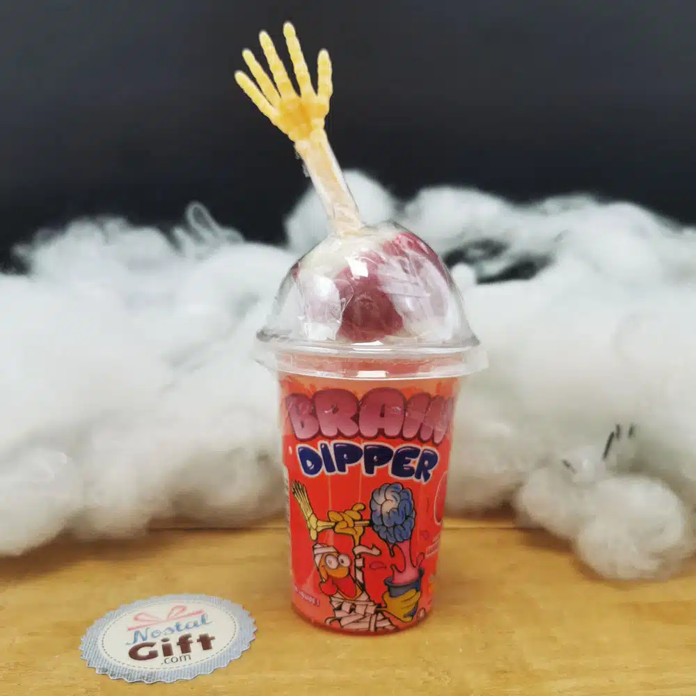 Quoi de plus horrible qu’un cerveau qui repose sur un os d’avant bras ou de la jambe. C’est ce que nous vous proposons pour Hallowwen avec ces friandises “Brain Dipper”. Des friandises effrayantes mais délicieuses ! Choisissiez votre sucette, trempez la dans des sirops acidulés puis léchez.