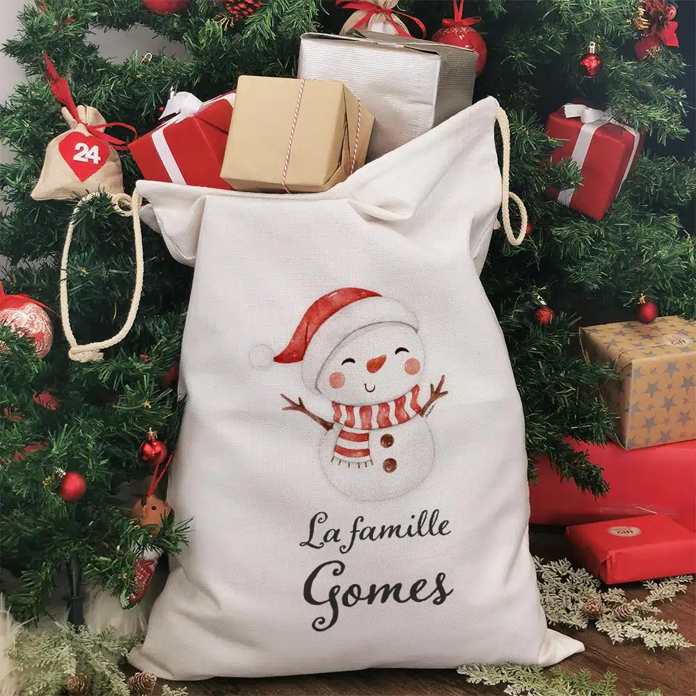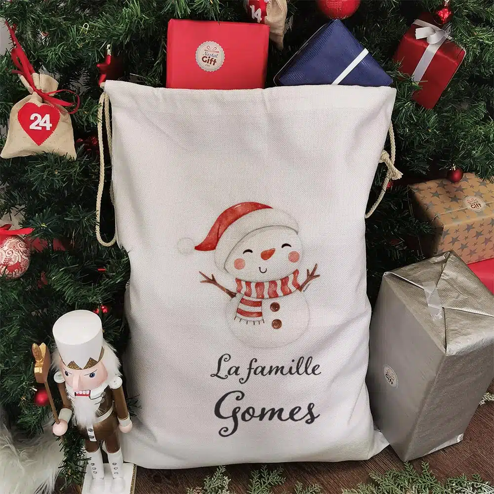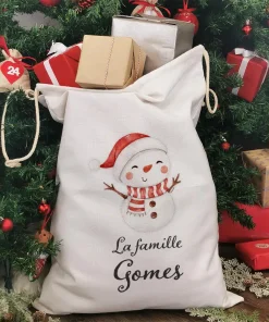 Hotte de Noël personnalisée – “La famille ..” – Bonhomme de neige
