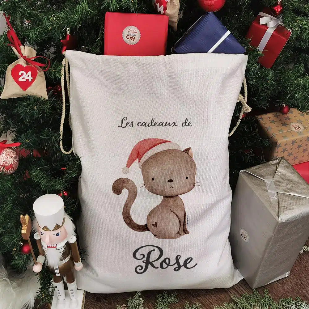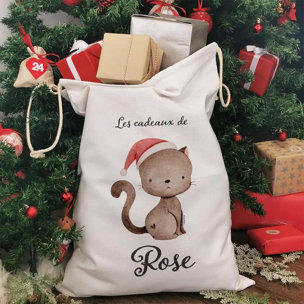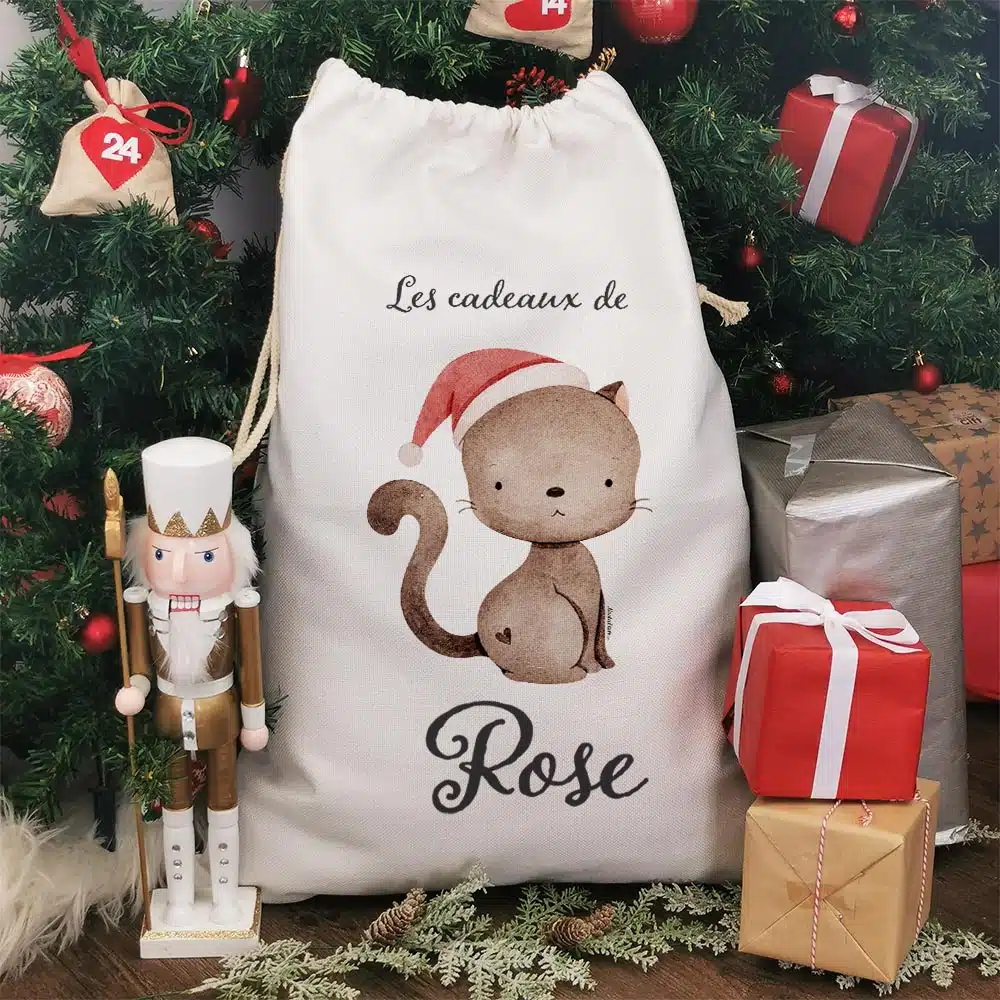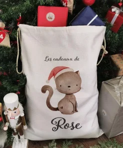 Hotte de Noël personnalisée – “Les cadeaux de …” – Chat de Noël