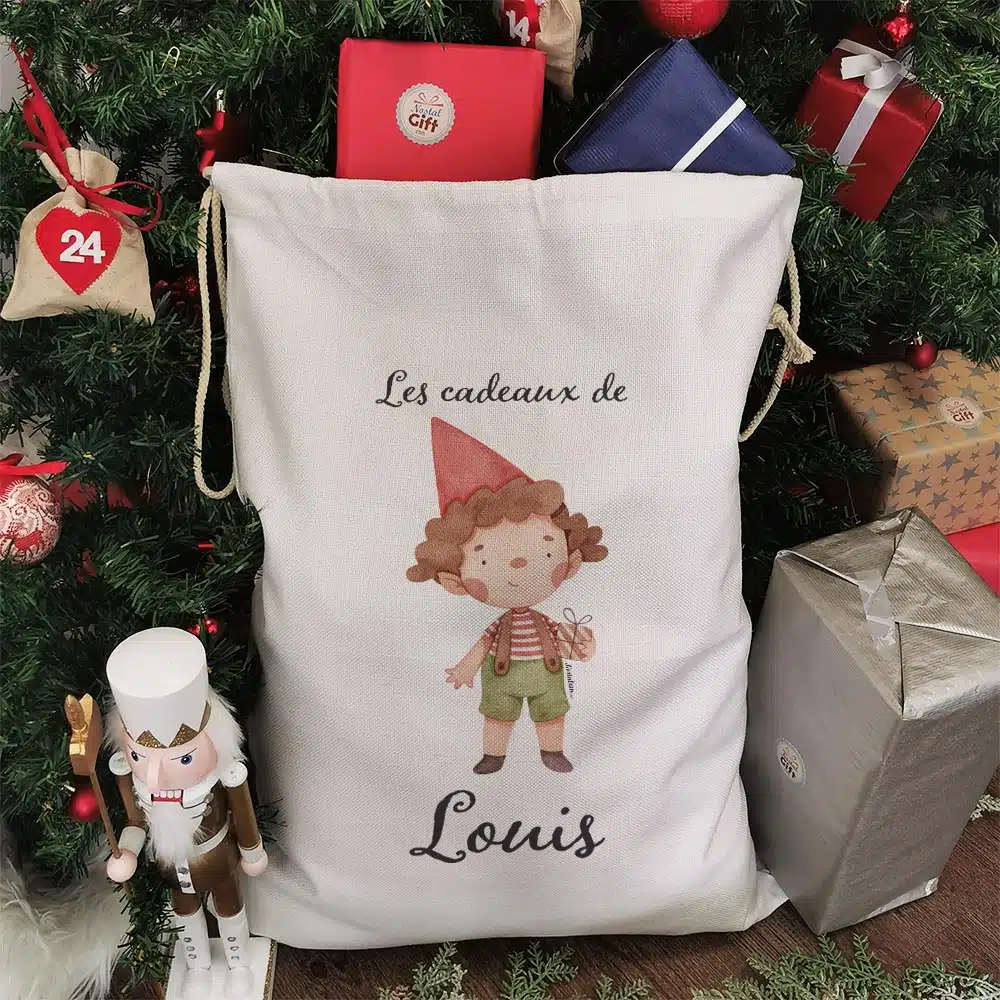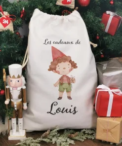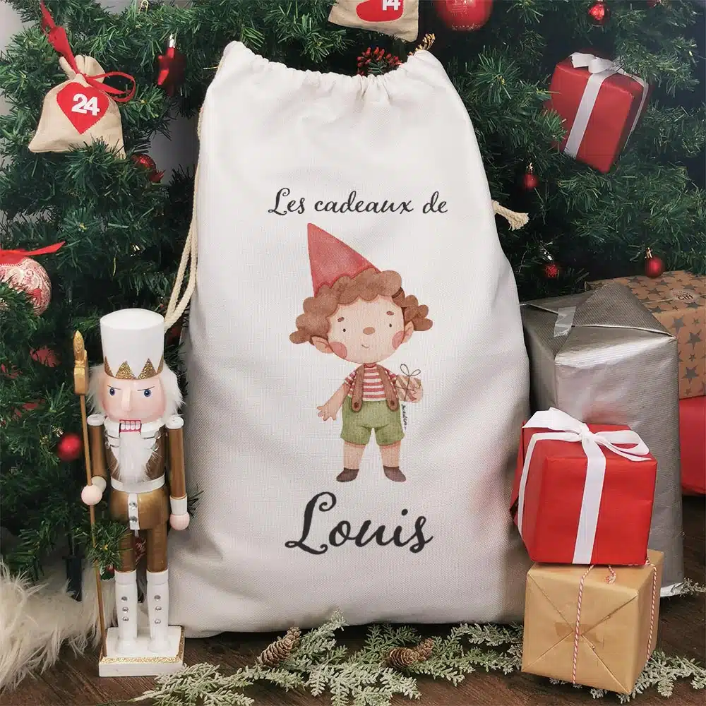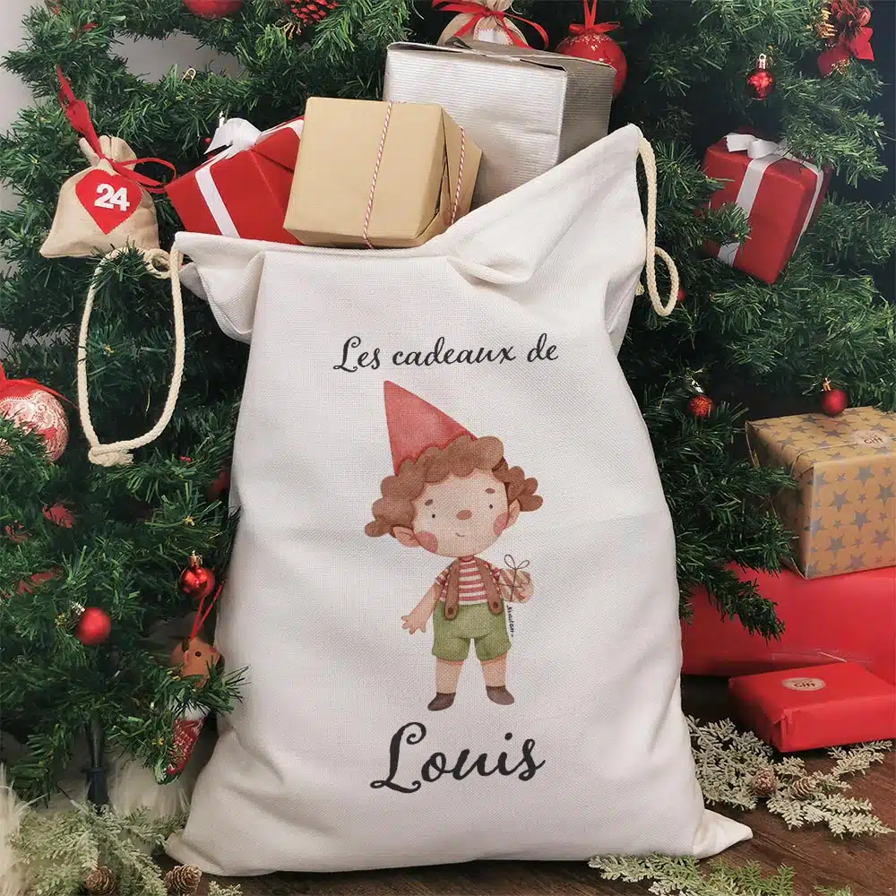 Hotte de Noël personnalisée – “Les cadeaux de …” – Lutin (Garçon)