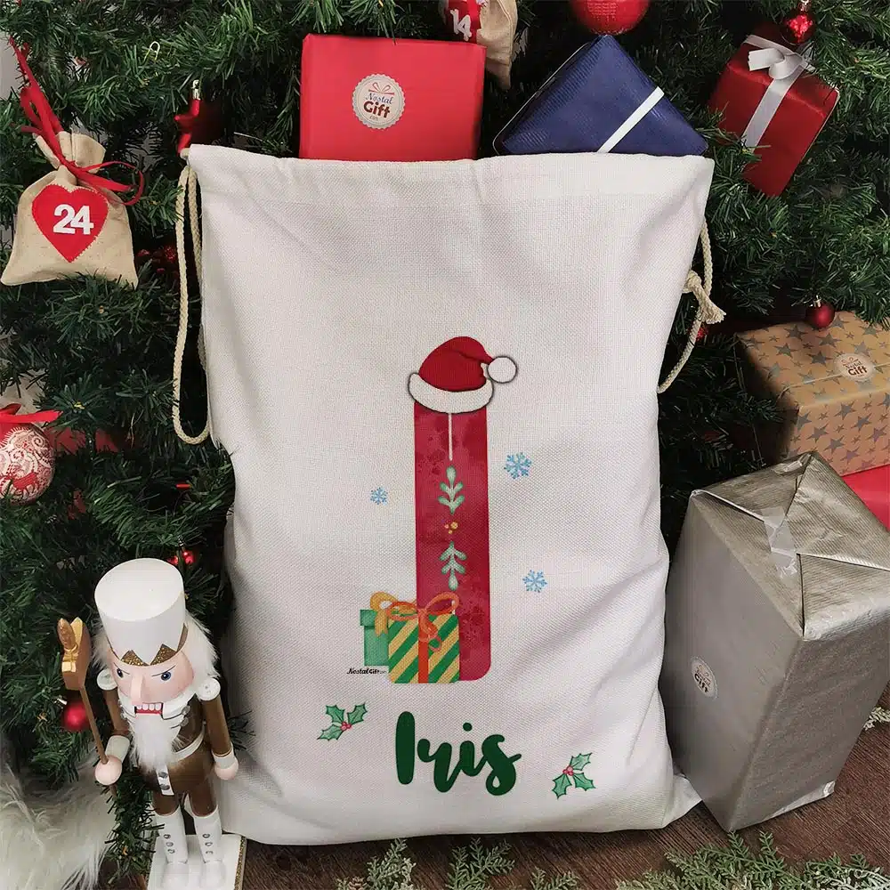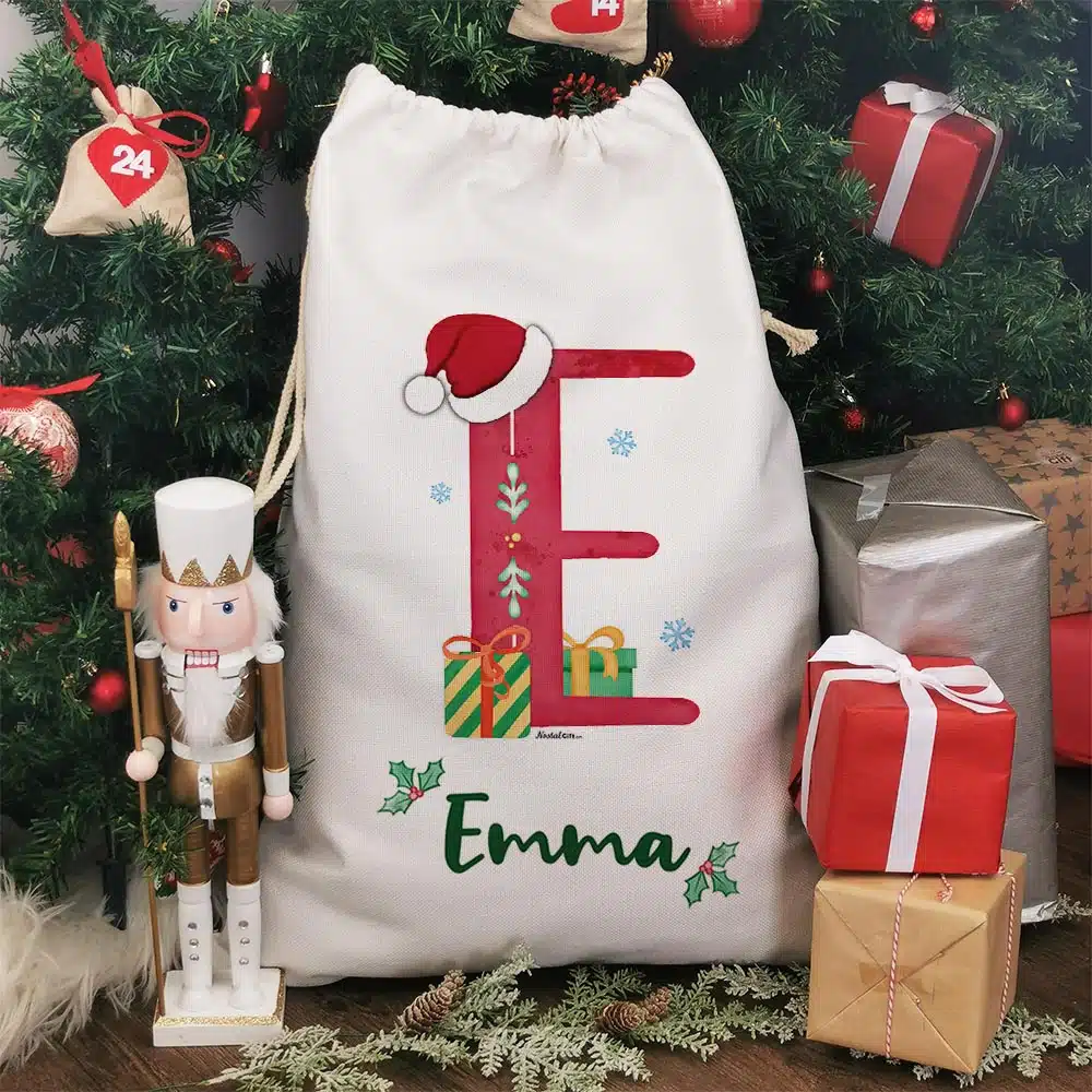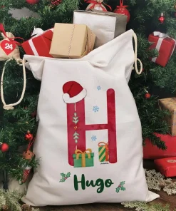 Les fêtes de Noël approchent et pour gâter petits et grands, les cadeaux vont pleuvoir. La hotte de Noël personnalisée avec le prénom Et la 1ère lettre du prénom, est un indispensable pour regrouper les nombreux cadeaux. Avec sa très grande taille de 68cm de haut, cette hotte sera parfaite. Son design inspiré du décorateur personnel du Père Noël ravira petits et grands.