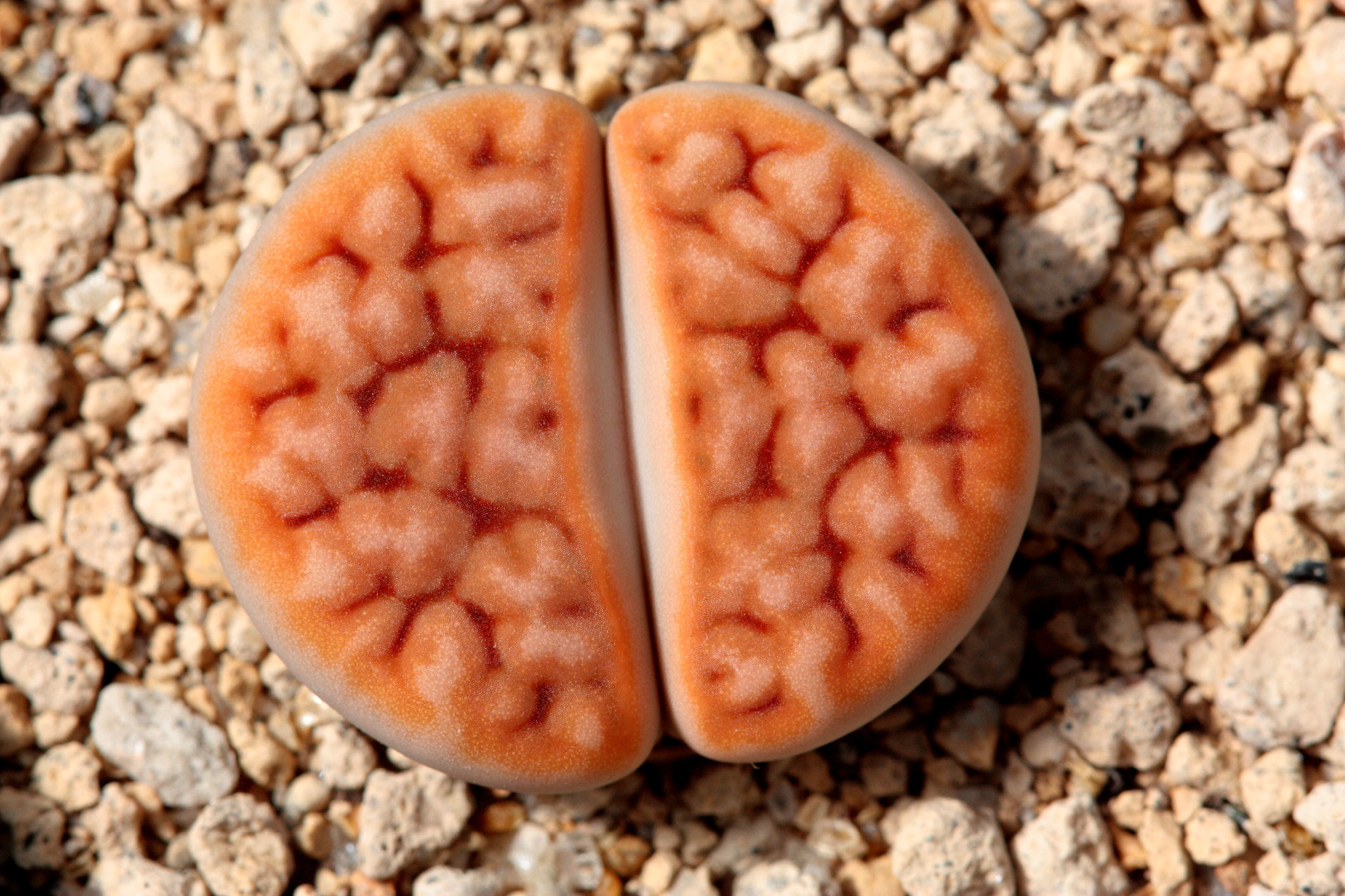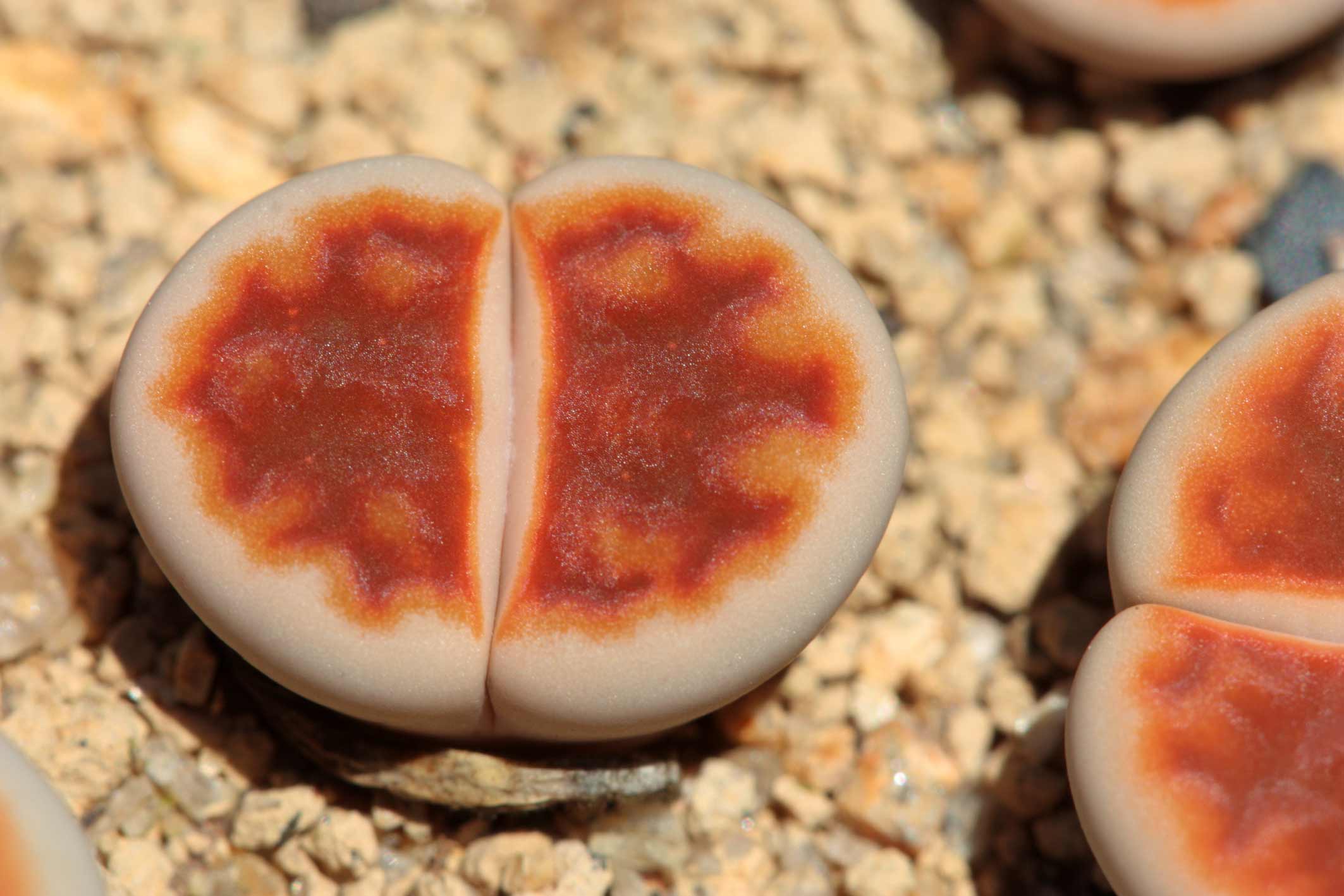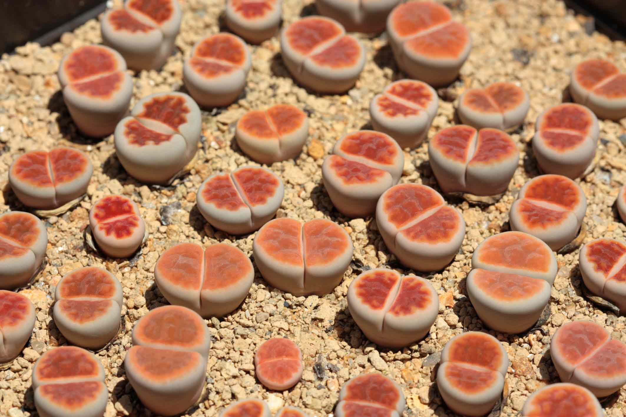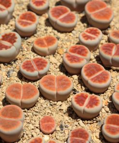 Le Lithops Karasmontana Red Top se distingue par ses feuilles charnues en forme de galets, qui sont imbriquées les unes dans les autres pour former une rosette compacte. Ces feuilles ont une texture rugueuse et une couleur allant du gris au brun, leur donnant l’apparence de véritables pierres. Cependant, ce qui rend cette variété particulièrement intéressante, c’est sa partie supérieure, qui se colore d’un rouge vif lors de périodes de forte exposition au soleil.