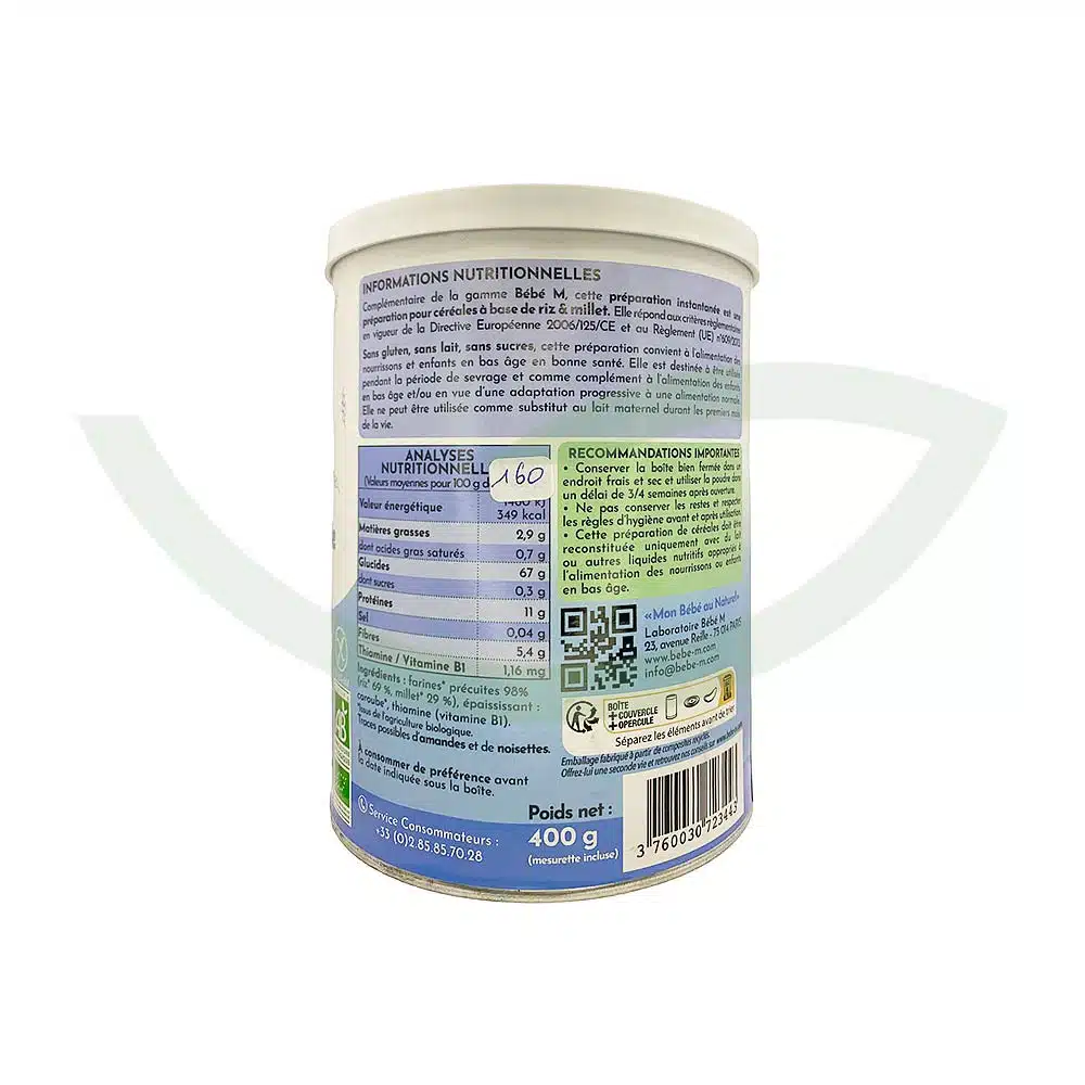 Ma 1ère céréale de Bébé M, sont des céréales faites de riz bio et millet bio, une formule végétarienne pour nouveau-nés. Ma 1ère céréale est idéale pour l’alimentation des nouveau-nés à partir de 4 mois et des jeunes enfants en bonne santé. Enrichie en lithothamne, cette céréale bio favorise la bonne santé osseuse de votre bébé. Elle est conçue pour être utilisée comme complément à l’alimentation des nourrissons pendant la phase de sevrage et/ou pour leur adaptation progressive à une alimentation régulière.