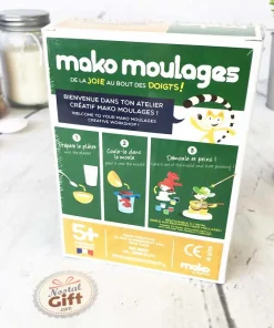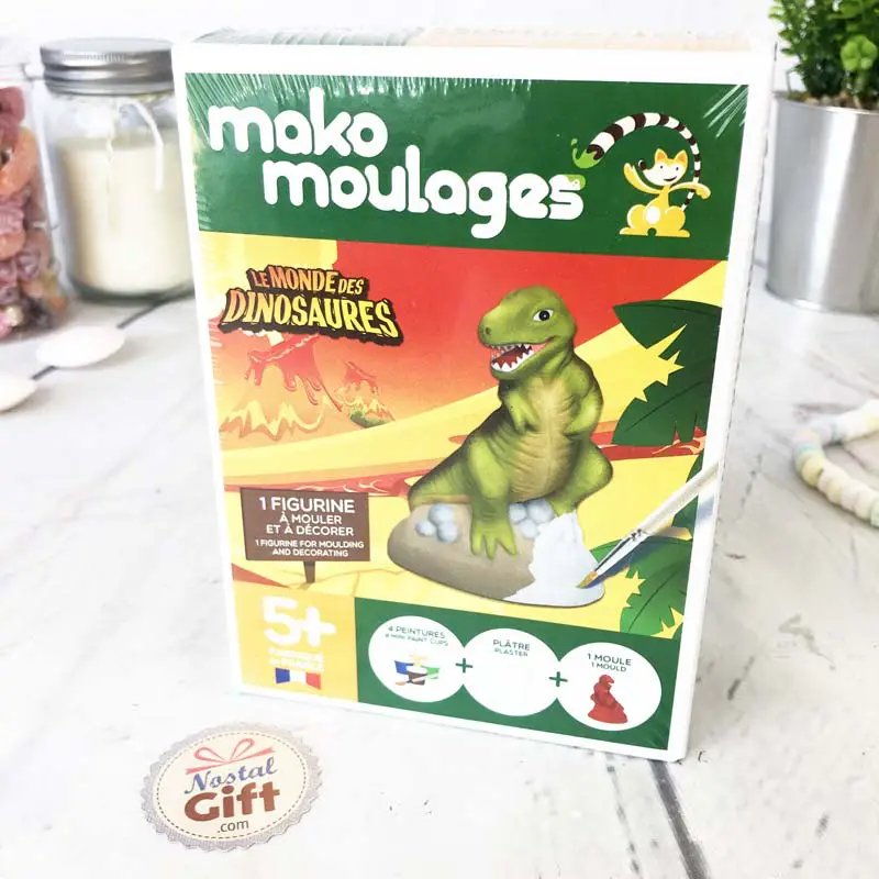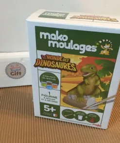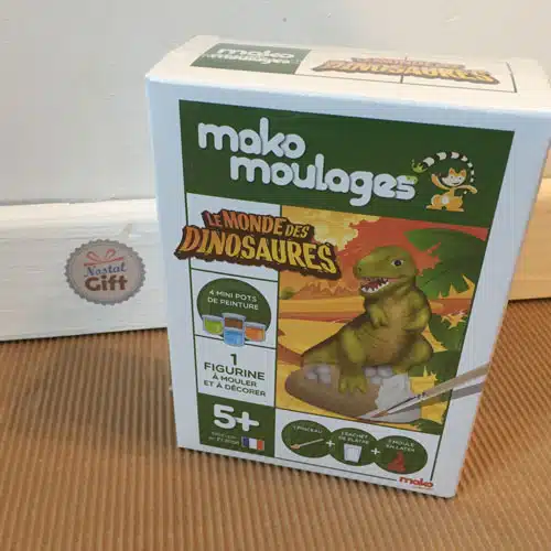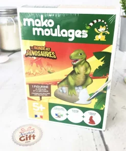 – Le coffret contient : 1 moule en latex de dinosaure (Tyrannosaure), 4 pots de peinture, 1 sachet de plâtre (150g), 1 pinceau, des croisillons pour tenir le moules.