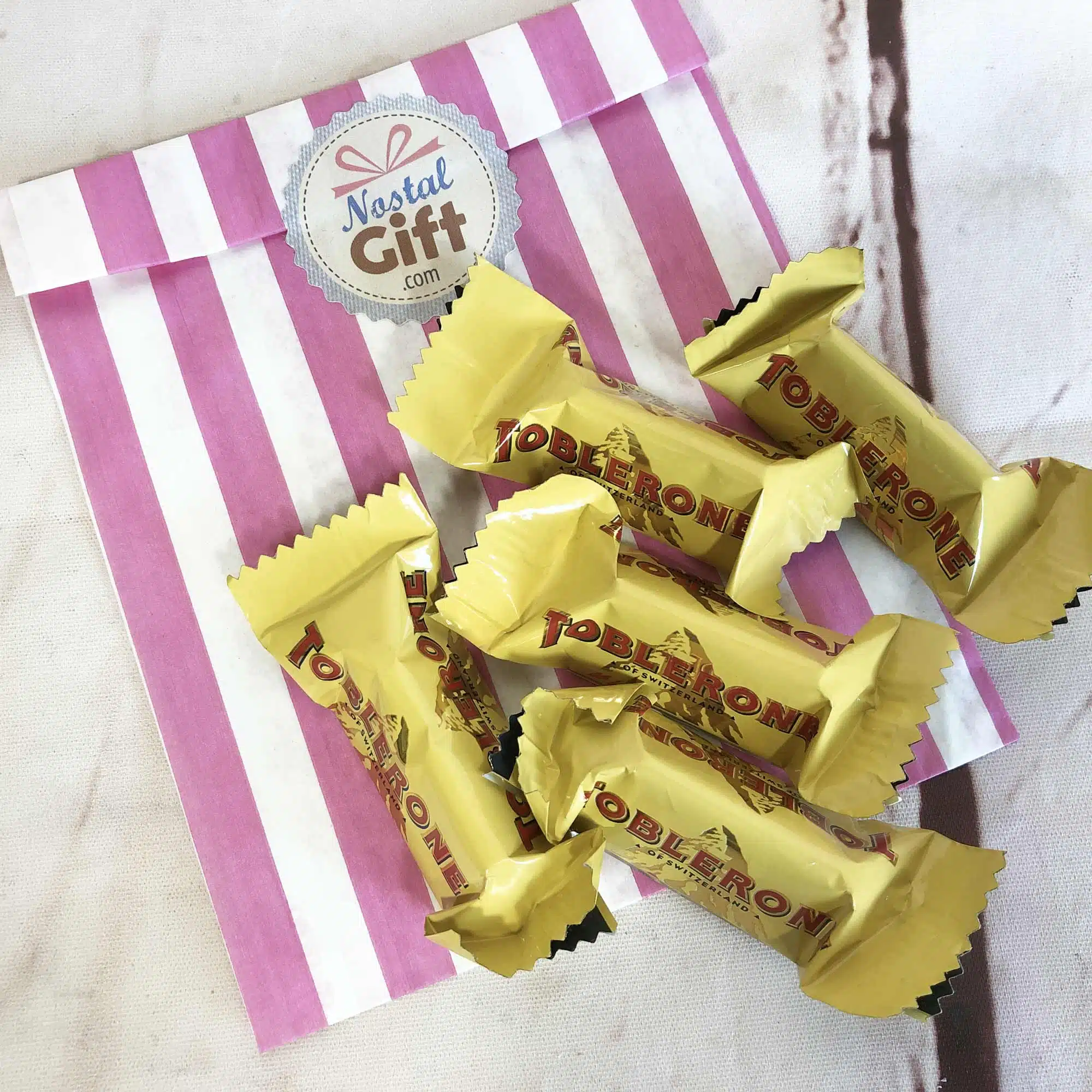 Mini barres Toblerone au lait : Le goût des montagnes Suisses est bien présent sur NostalGift, faites-vous plaisir avec cette gourmandise qui est la subtile rencontre du chocolat et du nougat à l’amande !