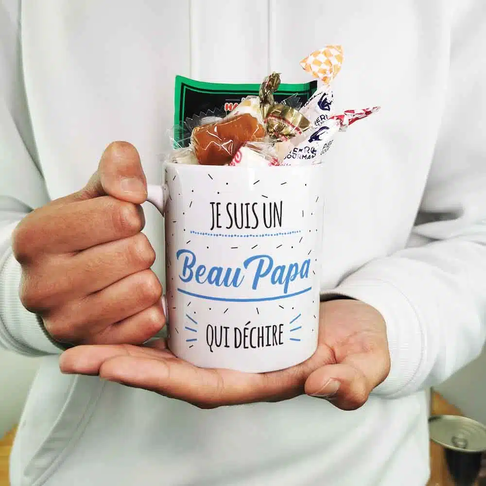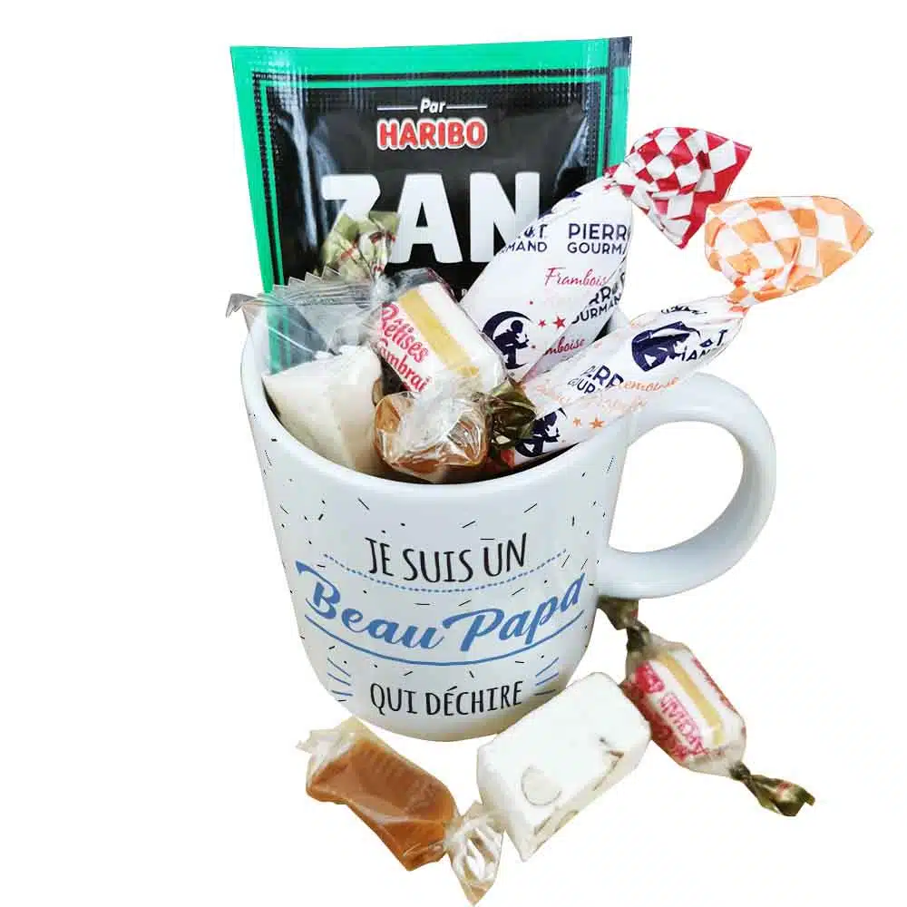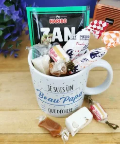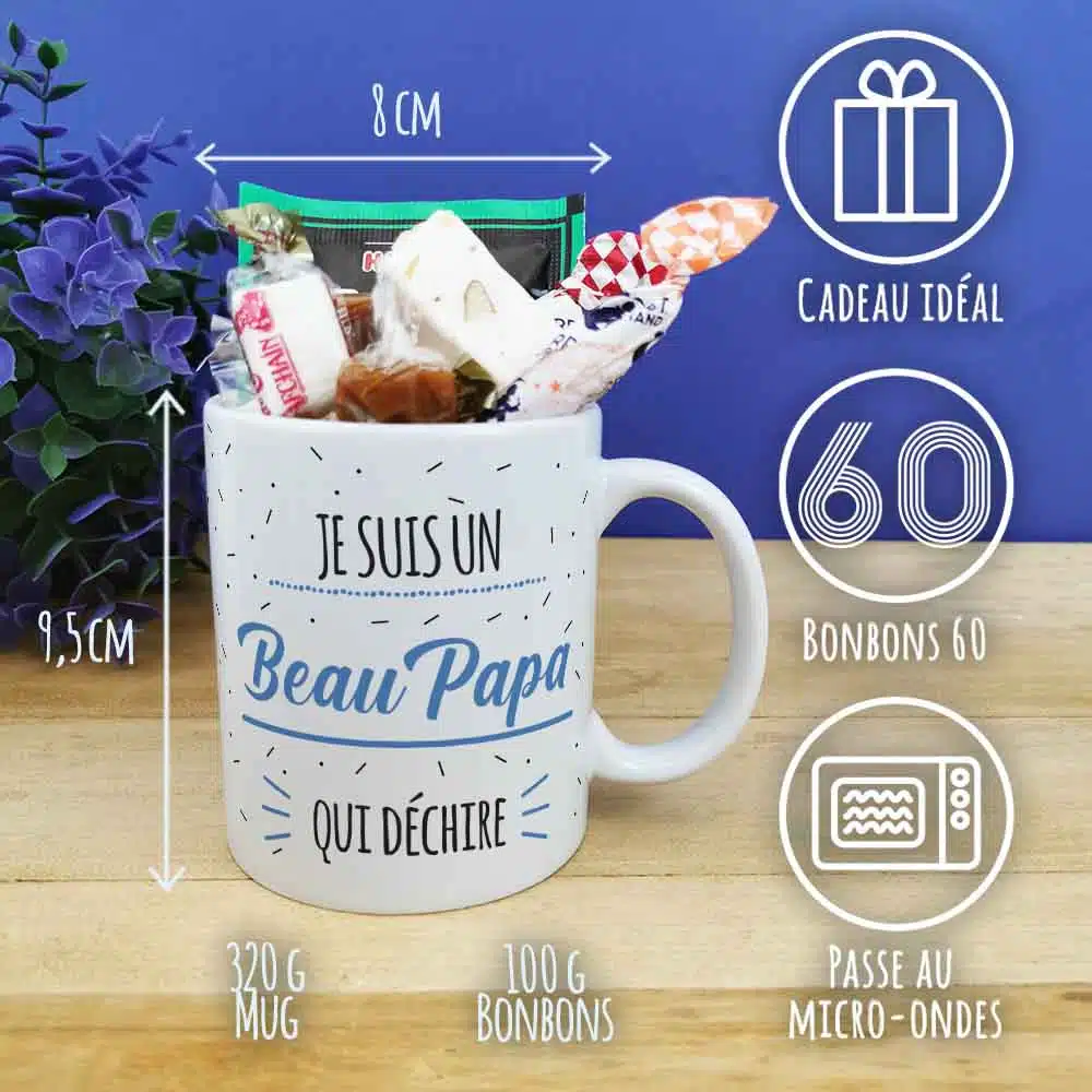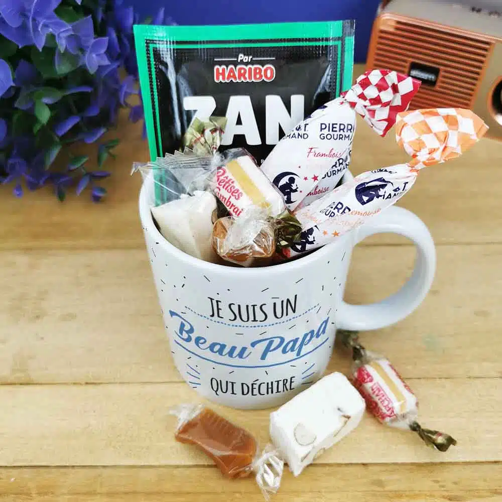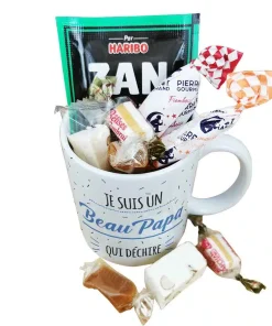 A la recherche d’un cadeau pour beau pere qui fait plaisir pour la fête des pères ou fêter un anniversaire de votre beau père ? Avec notre tasse de bonbons 60 arborant l’inscription “votre beau père” sur l’avant et l’arrière de la tasse en céramique on est sûr que vous allez faire plaisir ! Cette tasse a un contenance de 320ml et elle est idéale pour savourer une boisson chaude lors de vos moments de détente.Dans cette version, la tasse est garnie de quelques bonbons afin de faire fondre ceux qui étaient enfants dans les années 60 avec des Pierrot gourmand, le fameux ZAN à la réglisse de Haribo et autres confiseries. De plus, cette tasse est lavable au lave-vaisselle et utilisable au micro-onde et au four, offrant une grande polyvalence pour votre confort au quotidien. L’emballage est également soigné, avec une boîte en carton blanche et une étiquette reprenant le design bleu de la tasse. L’impression est réalisée dans notre atelier en France pour une qualité irréprochable.Contenance : 320mlPoids : 0,345gMatière : tasse en céramique de qualité supérieureInscription à l’avant et à l’arrière : Je suis un Beau Papa qui déchireEmballage : livré dans une boite en carton blanche avec une étiquette reprenant le design du mug bleuImpression : Imprimé dans notre atelier en FranceContient : 2 sucettes Pierrot Gourmand (gout aléatoire), 1 ZAN, 2 nougats tendres aux amandes, 2 caramels au beurre salé et 2 bêtises de Cambrai.Caractéristique technique : Lavable au lave vaisselle, utilisable au micro-onde et au four