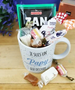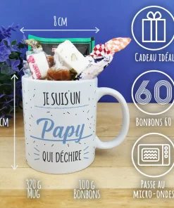 A la recherche d’un famille pour la fête des grands pères ou fêter un anniversaire de votre papy ? Avec notre tasse de bonbons 60 arborant l’inscription “votre papy” sur l’avant et l’arrière de la tasse, on est sûr que vous allez faire plaisir ! De plus, cette tasse est lavable au lave-vaisselle et utilisable au micro-onde et au four, offrant une grande polyvalence pour votre confort au quotidien. L’emballage est également soigné, avec une boîte en carton et une étiquette reprenant le design bleu de la tasse. L’impression est réalisée dans notre atelier en France pour une qualité irréprochable.