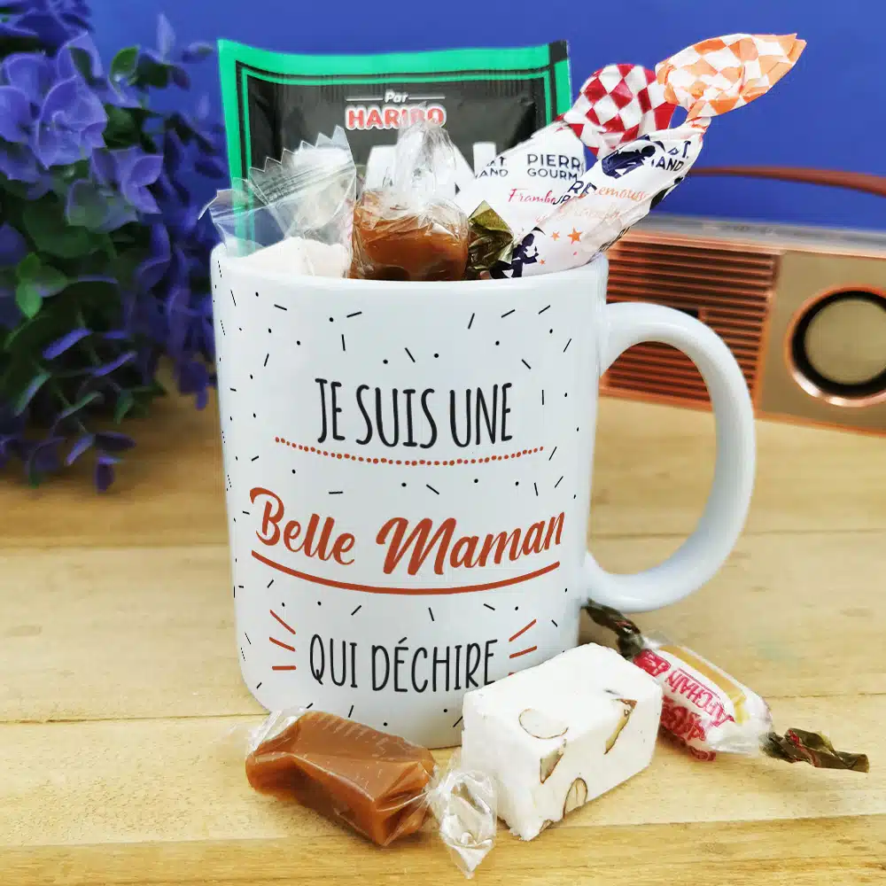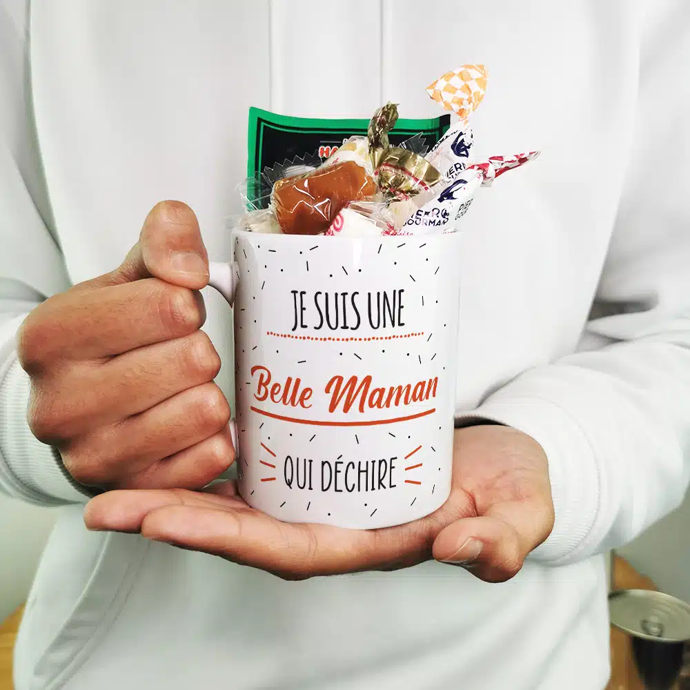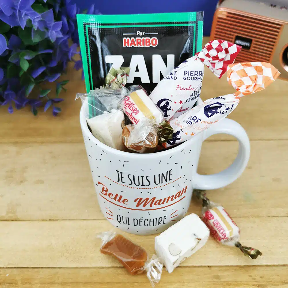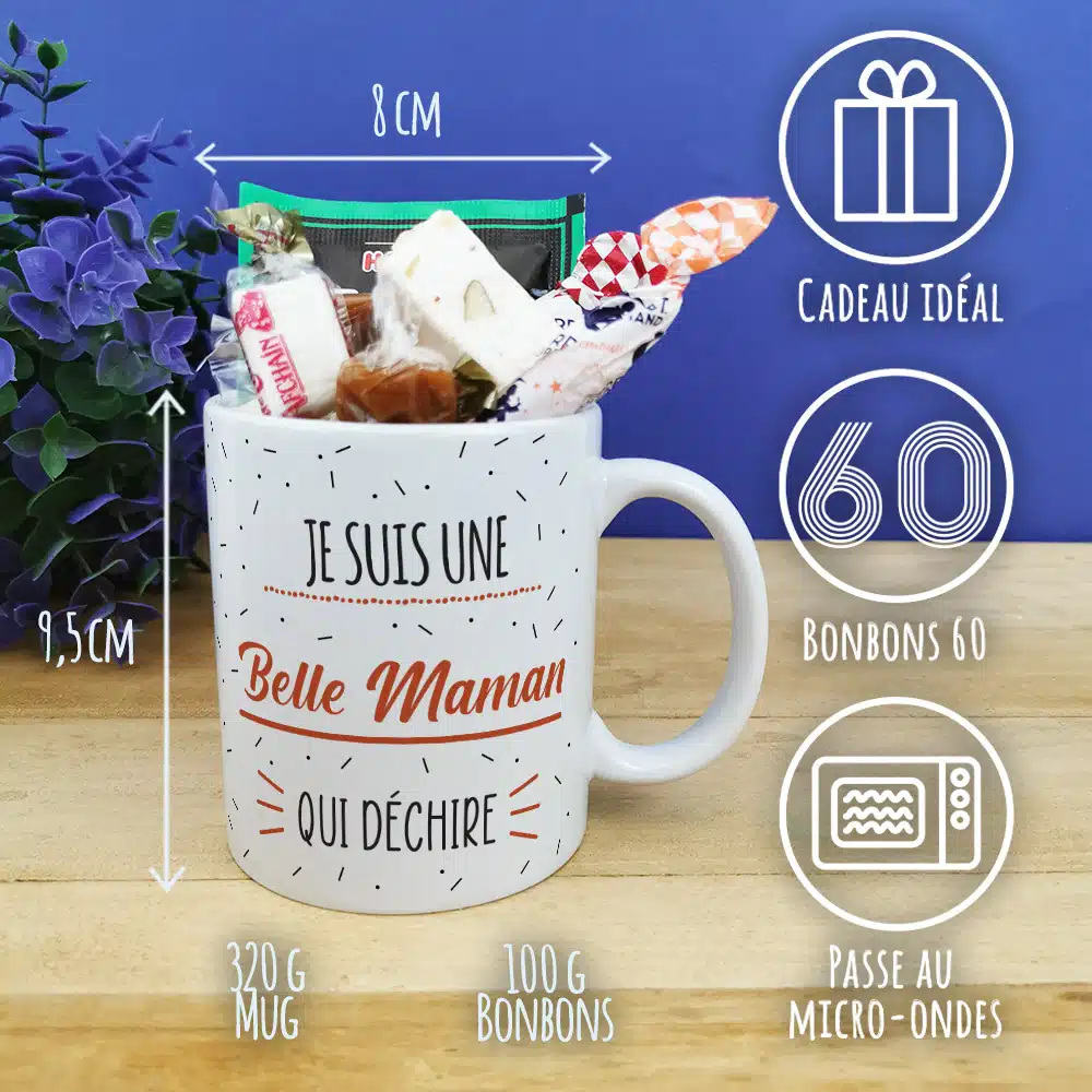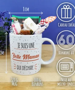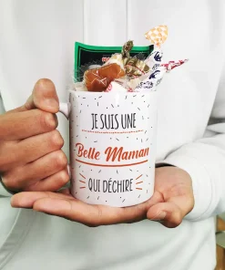 A la recherche d’un cadeau pour belle mere original pour la fête des mères ou fêter un anniversaire de votre belle maman ? Avec notre tasse de bonbons 60 arborant l’inscription “votre belle maman” sur l’avant et l’arrière de la tasse en céramique on est sûr que vous allez faire plaisir ! Cette tasse a un contenance de 320ml et elle est idéale pour savourer une boisson chaude lors de vos moments de détente.Dans cette version, la tasse est garnie de quelques bonbons afin de faire fondre ceux qui étaient enfants dans les années 60 avec des Pierrot gourmand, le fameux ZAN à la réglisse de Haribo et autres confiseries. De plus, cette tasse est lavable au lave-vaisselle et utilisable au micro-onde et au four, offrant une grande polyvalence pour votre confort au quotidien. L’emballage est également soigné, avec une boîte en carton blanche et une étiquette reprenant le design bordeaux de la tasse. L’impression est réalisée dans notre atelier en France pour une qualité irréprochable.Contenance : 320mlPoids : 0,345gMatière : tasse en céramique de qualité supérieureInscription à l’avant et à l’arrière : Je suis une belle maman qui déchireEmballage : livré dans une boite en carton blanche avec une étiquette reprenant le design du mug bordeauxImpression : Imprimé dans notre atelier en FranceContient : 2 sucettes Pierrot Gourmand (gout aléatoire), 1 ZAN, 2 nougats tendres aux amandes, 2 caramels au beurre salé et 2 bêtises de Cambrai.Caractéristique technique : Lavable au lave vaisselle, utilisable au micro-onde et au four