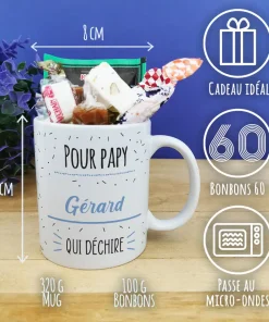 A la recherche d’un cadeau de Noël ou d’ anniversaire pour votre papy ? Avec notre tasse de bonbons 60 arborant l’inscription “votre papy” sur l’avant et l’arrière de la tasse, on est sûr que vous allez faire plaisir ! De plus, cette tasse est lavable au lave-vaisselle et utilisable au micro-onde et au four, offrant une grande polyvalence pour votre confort au quotidien. L’emballage est également soigné, avec une boîte en carton et une étiquette reprenant le design bleu de la tasse.