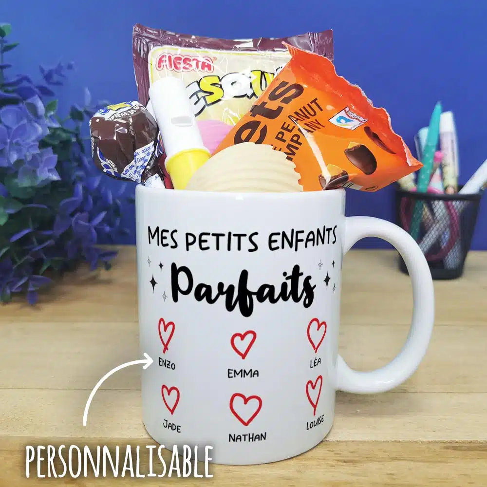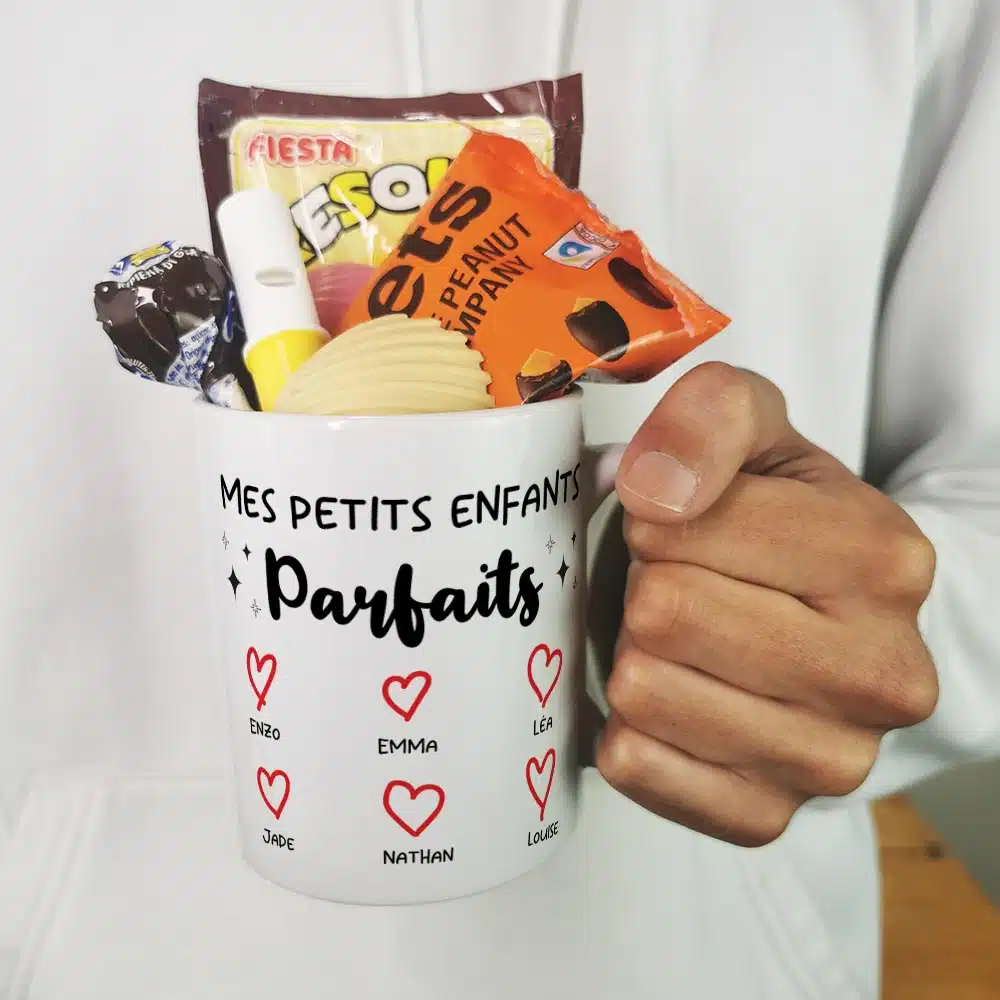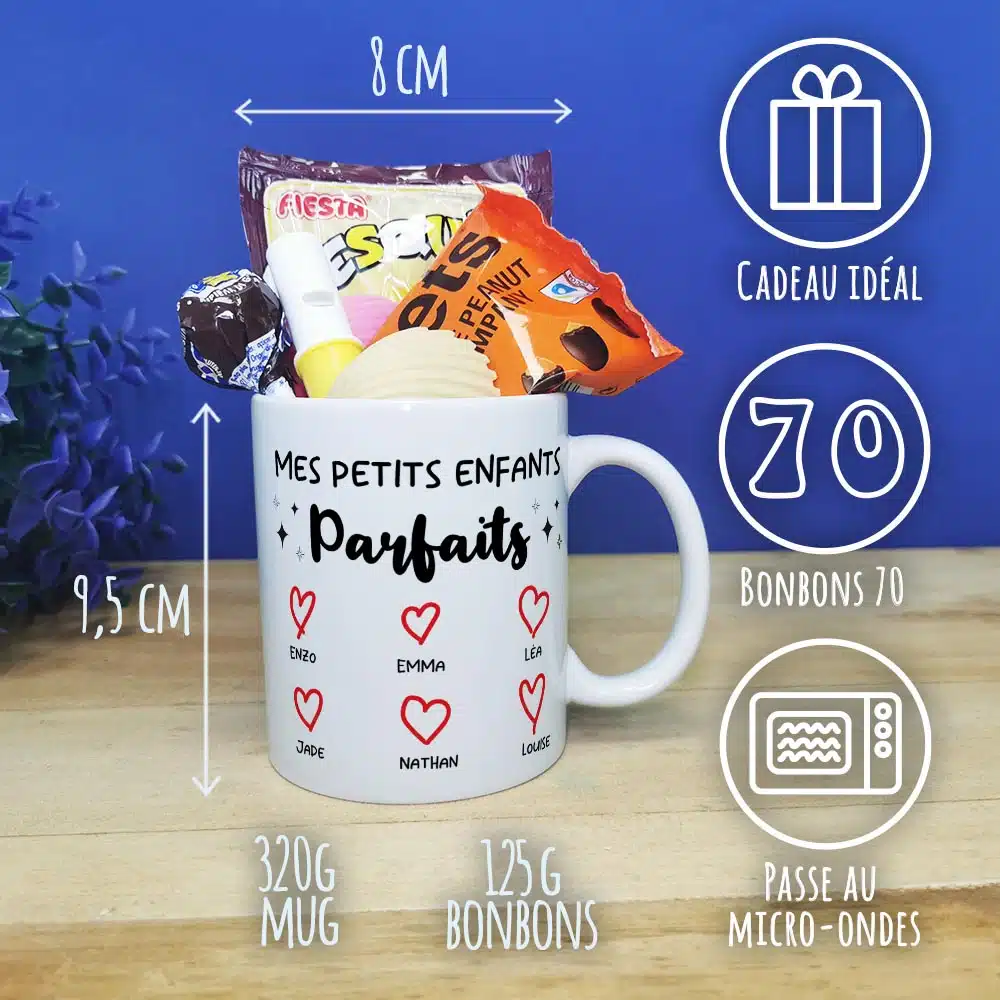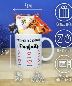 Offrez un cadeau original et pratique pour la fête des grands pères ou la fête des grands mères ou fêter un anniversaire de votre proche avec notre tasse personnalisée, arborant des confiseries des années 70 avec l’inscription Mes petits enfants parfaits sur l’avant et l’arrière de la tasse. Avec sa contenance de 320ml, cette tasse pleine de bonbons est idéale pour savourer votre boisson préférée lors de vos moments de détente.