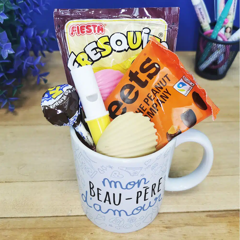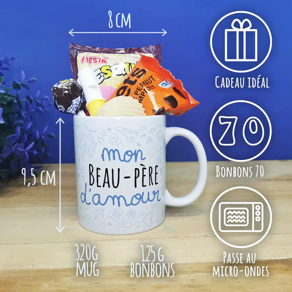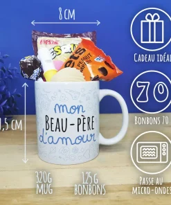 Offrez un cadeau original et pratique pour un anniversaire ou Noël avec notre tasse, arborant “Mon beau-père d’amour” rempli des confiseries des années 70. Avec sa contenance de 320 ml, cette tasse pleine de bonbons est idéale pour savourer votre boisson préférée lors de moments de détente.