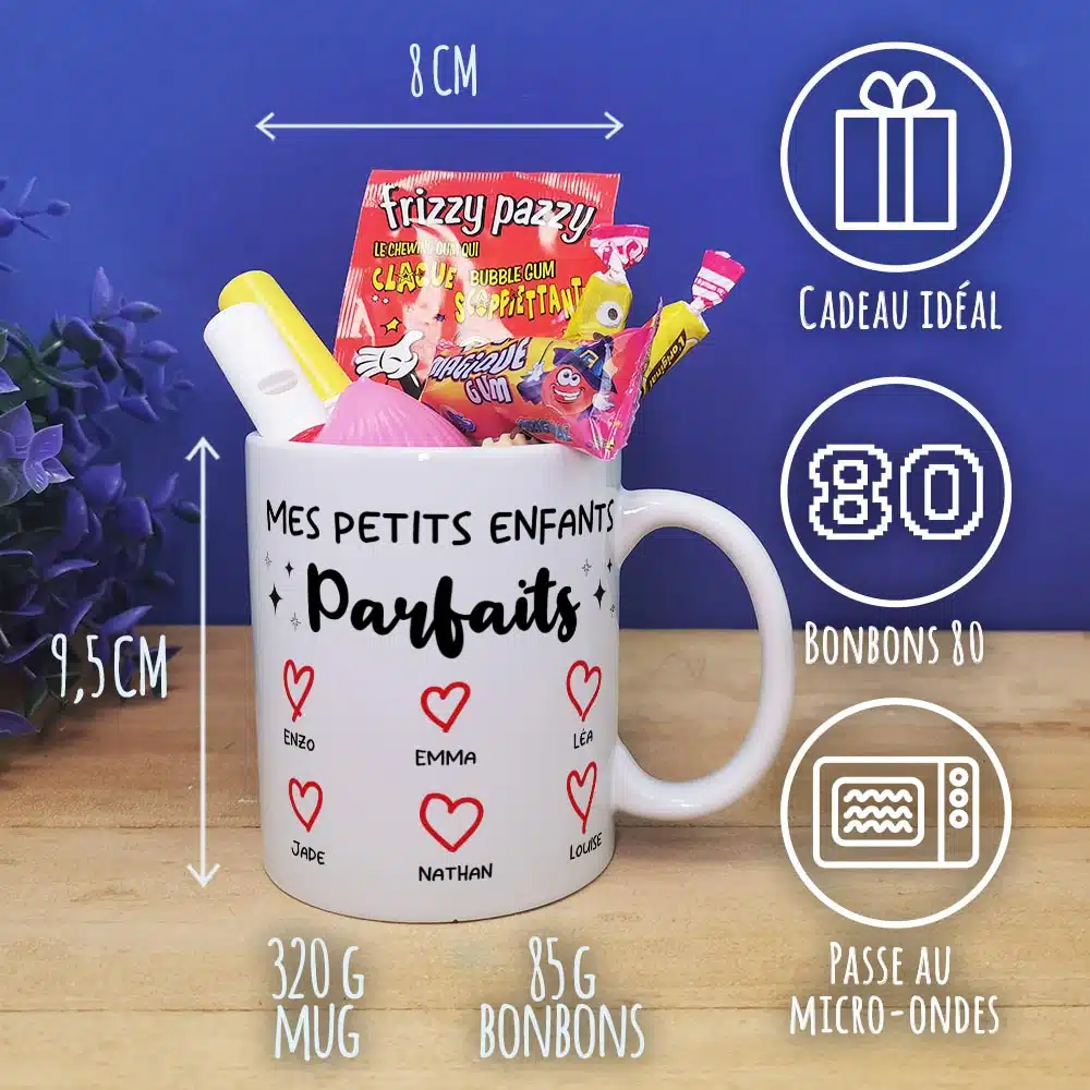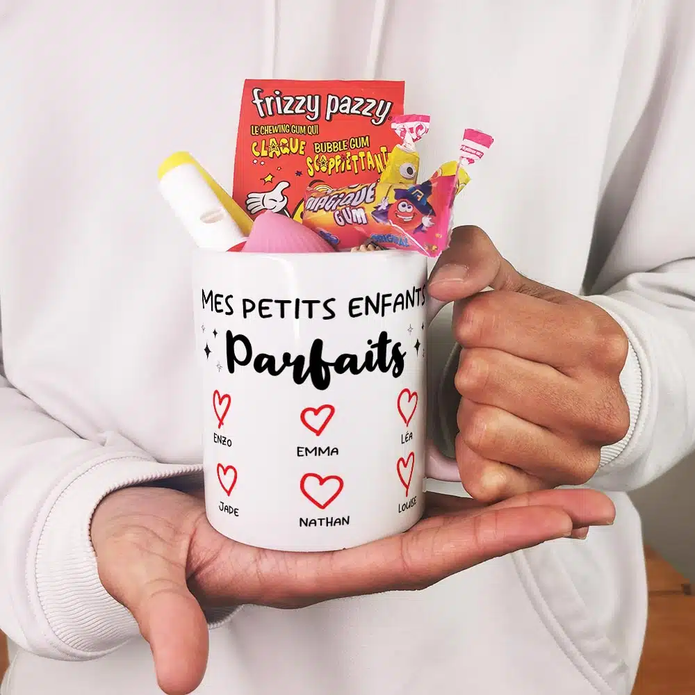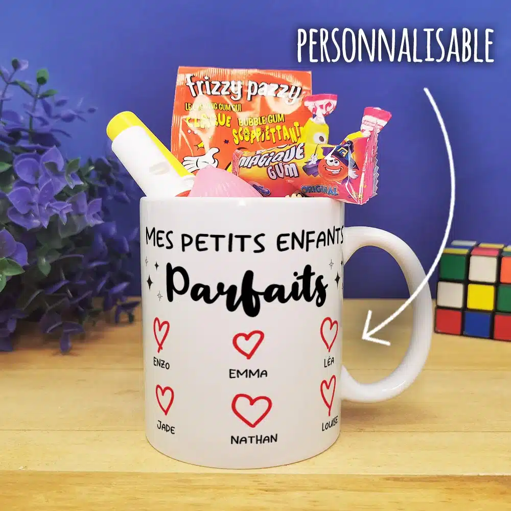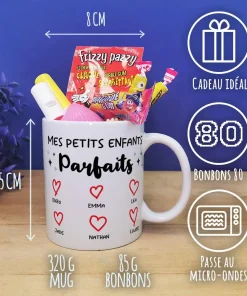 Offrez un cadeau original pour mamie ou cadeau qui fait plaisir pour papy original et pratique pour la fête des grands pères ou la fête des grands mères ou fêter un anniversaire avec notre tasse personnalisée, arborant “Mes petits enfants parfaits” en inscription sur l’avant et l’arrière de la tasse.