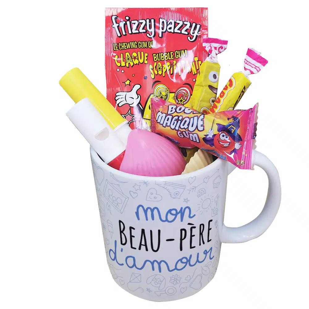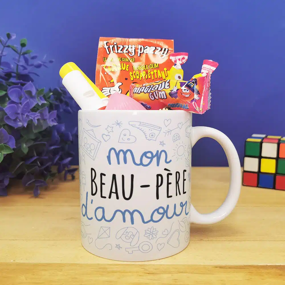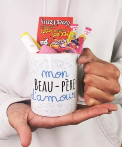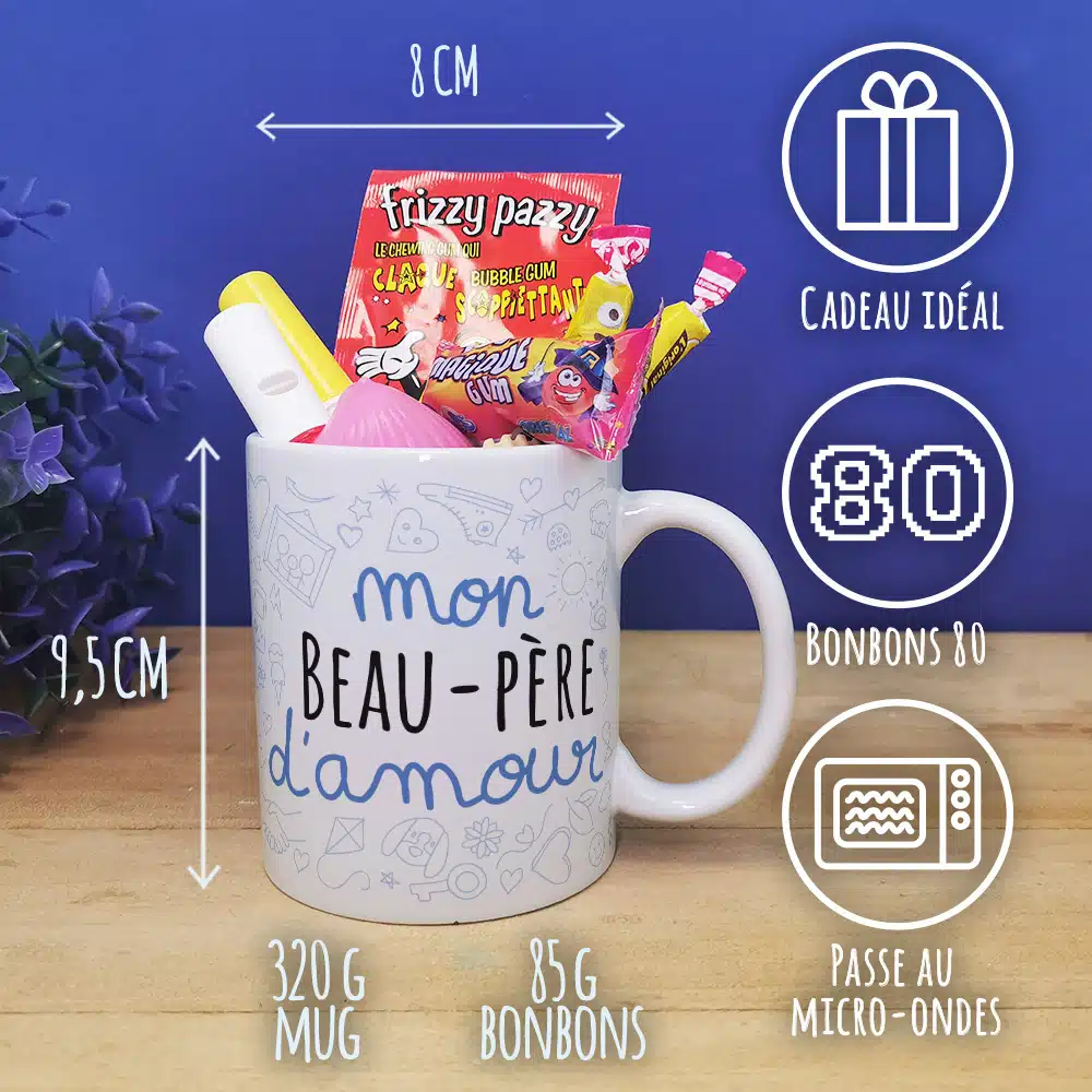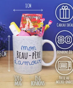 Offrez un cadeau de Noëlau joli designpour beau pere original et pratique pour fêter un anniversaire ou Noël avec notre tasse personnalisée, arborant “Mon beau-père d’amour” en inscription sur l’avant et l’arrière de la tasse.