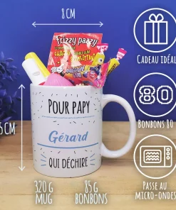 Offrez un cadeau original et pratique à votre grand-père avec notre tasse personnalisée, arborant “Pour papy qui déchire” sur l’avant et l’arrière de la tasse, et remplie de bonbons des années 80.