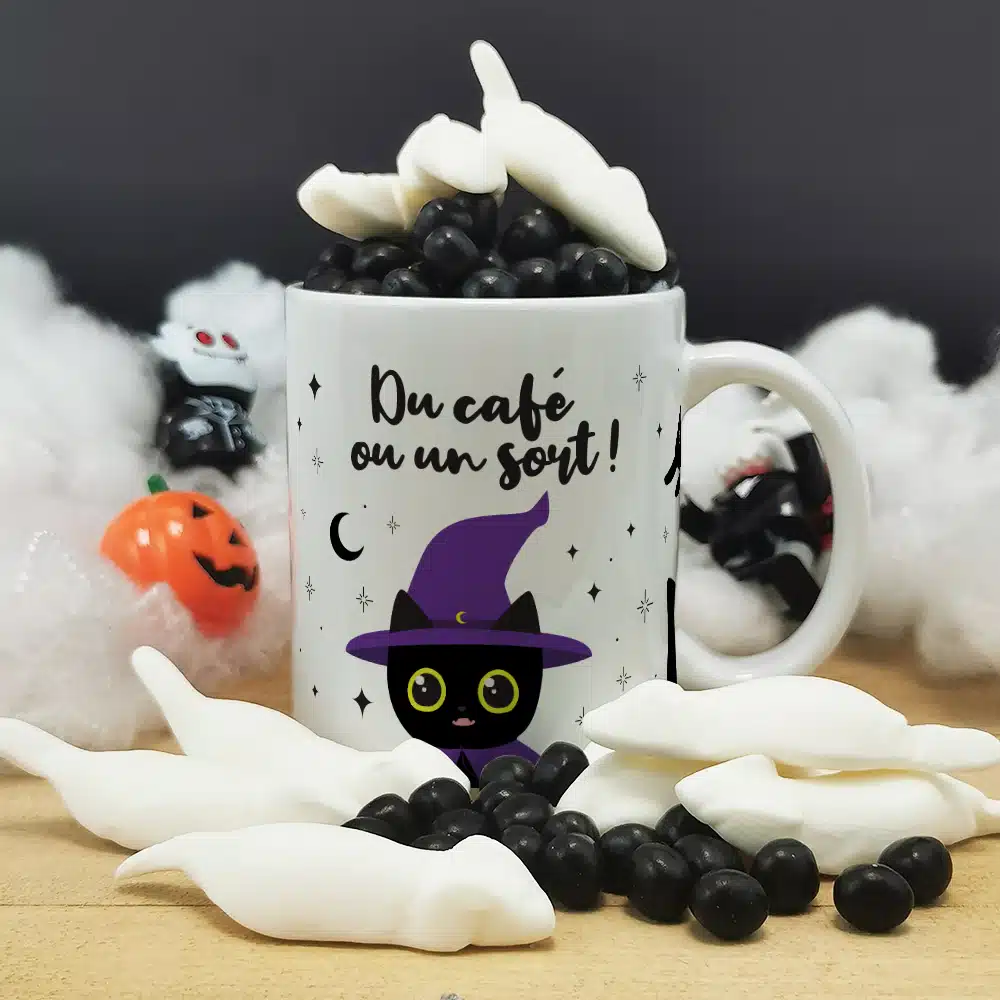 Sachet de 10 souris blanches et leur dragibus noir dans un mug au joli design “chat noir”