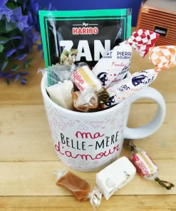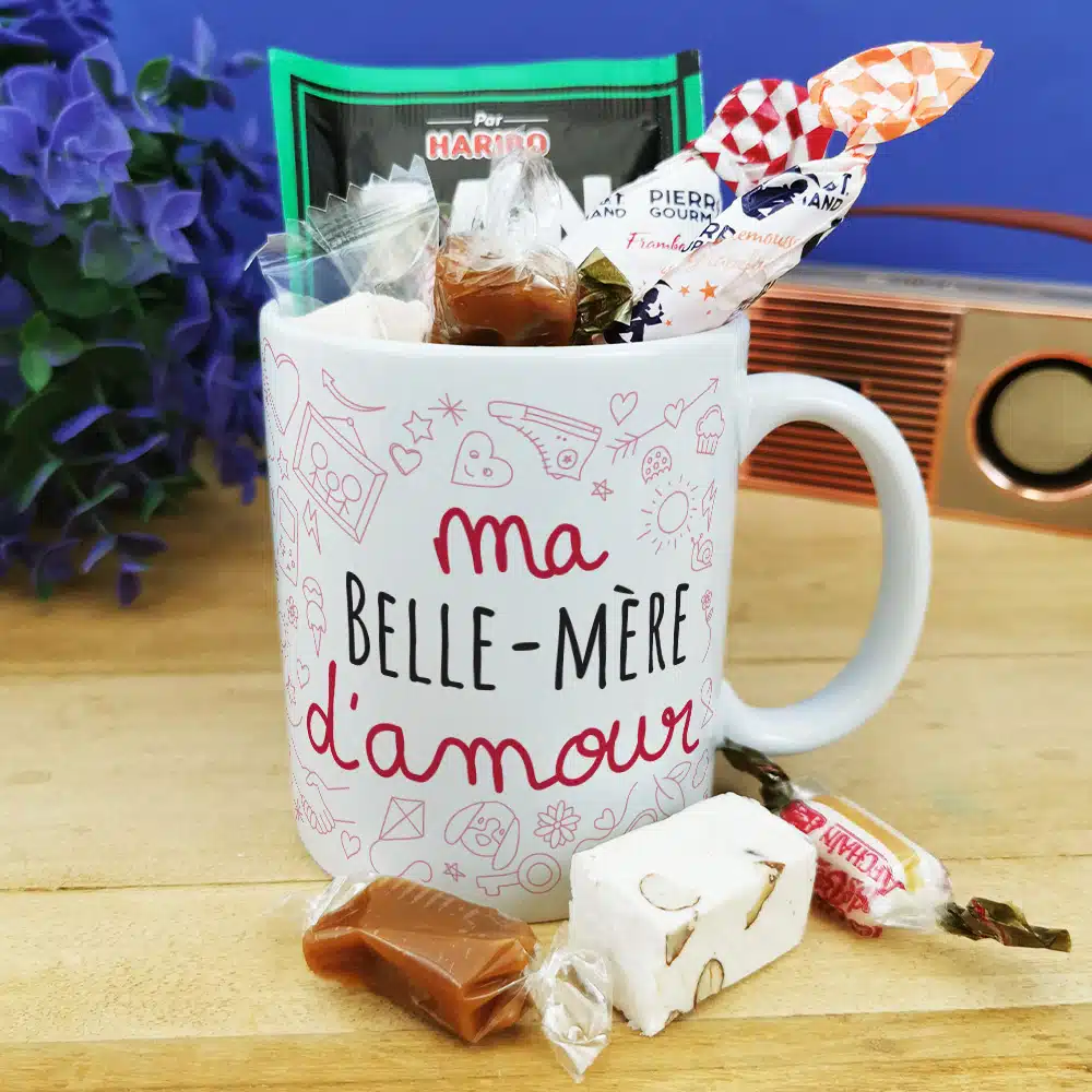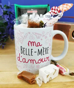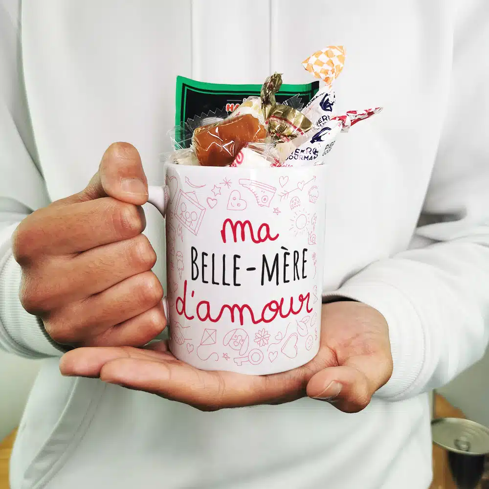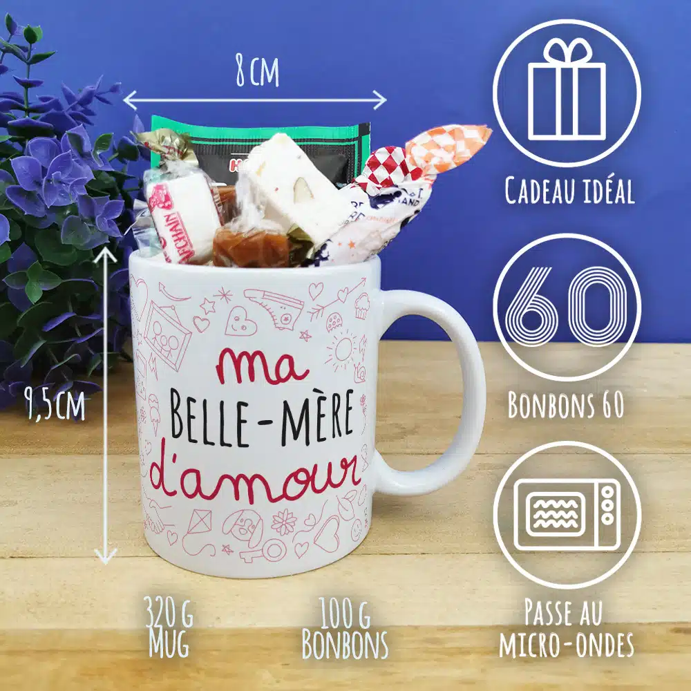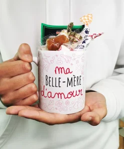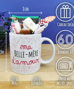 A la recherche d’un cadeau qui reste pour belle mere pour fêter un anniversaire ou Noël ? Avec notre tasse de bonbons 60 arborant l’inscription “Belle-mère d’amour” sur l’avant et l’arrière de la tasse, on est sûr que vous allez faire plaisir ! De plus, cette tasse est lavable au lave-vaisselle et utilisable au micro-onde et au four, offrant une grande polyvalence pour votre confort au quotidien. L’emballage est également soigné, avec une boîte en carton blanche et une étiquette reprenant le design rouge de la tasse. L’impression est réalisée dans notre atelier en France pour une qualité irréprochable.