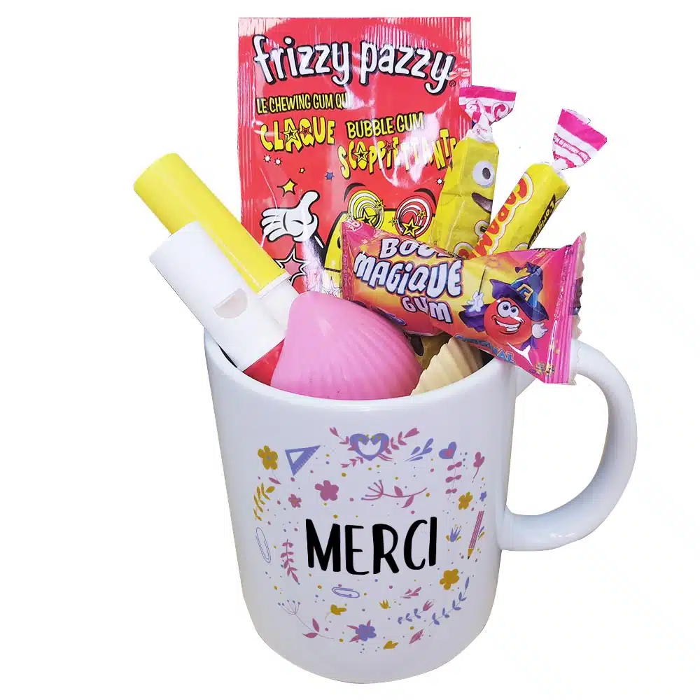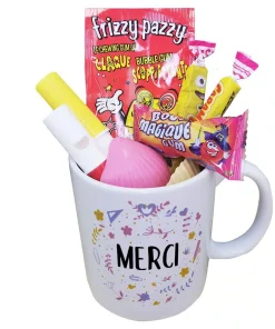 Contient : 1 Frizzy Pazzy à la fraise, 2 Carambar au caramel, 2 roudoudous, 2 bonbons sifflet dextrose et 1 boule magique