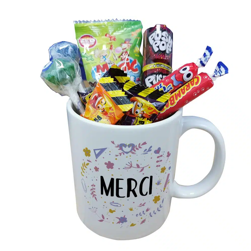 Contient : 2 Têtes brûlées à la fraise, 2 Carambar au cola, 2 sucettes tache langue, 1 sucette Push Pop au cassis, 1 Magic tétine