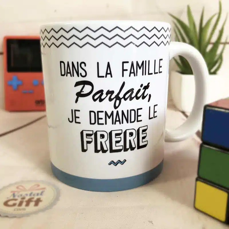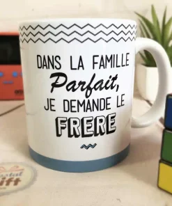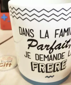 Pour une idée cadeau pour votre Frère préféré, voici un mug au design unique qui lui fera chaud au cœur…et aux mains ! Votre Frère prend souvent la grosse tête ou est tout simplement parfait, et vous pensez qu’il a entièrement sa place dans la famille Parfait. Pour le taquiner gentiment ou pour faire gonfler encore plus ses chevilles, offrez-lui ce mug inspiré du jeu des 7 familles.