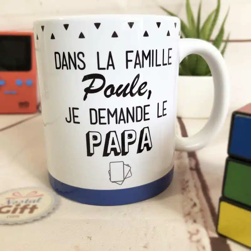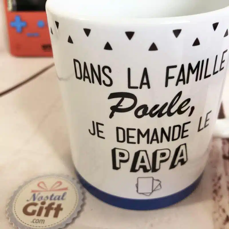 Pour une idée cadeau pour votre Papa chéri, voici un mug au design unique qui lui fera chaud au cœur…et aux mains ! Votre Papa vous a peut-être un peu trop gardé sous son aile, et vous pensez qu’il a entièrement sa place dans la famille Poule. Pour le taquiner gentiment, offrez-lui ce mug inspiré du jeu des 7 familles. Parfait pour la fête des pères ou son anniversaire !