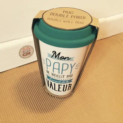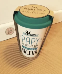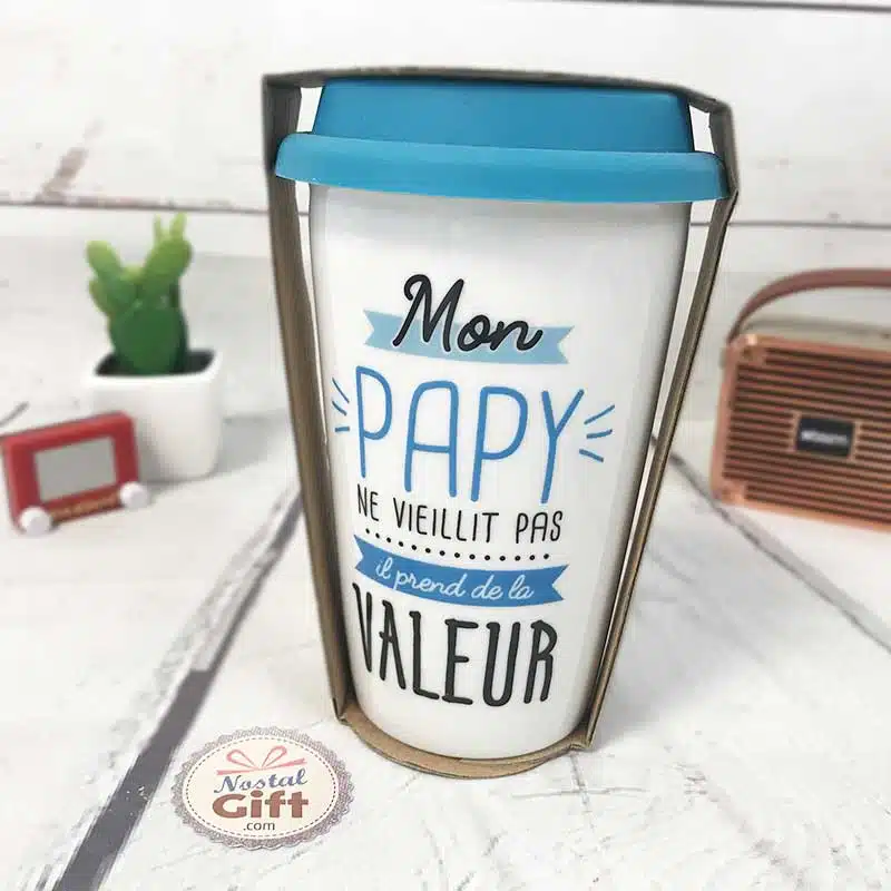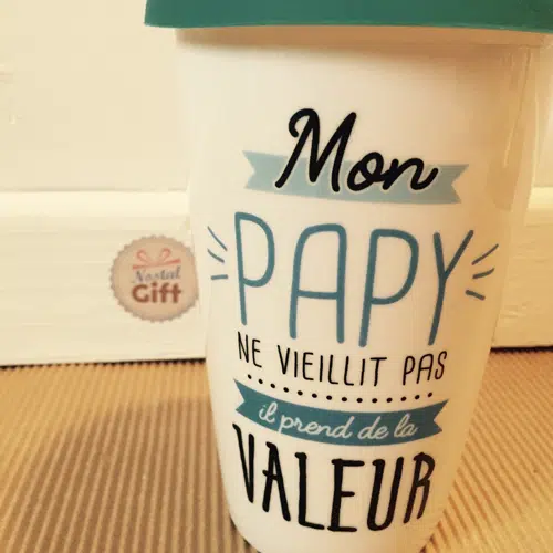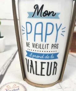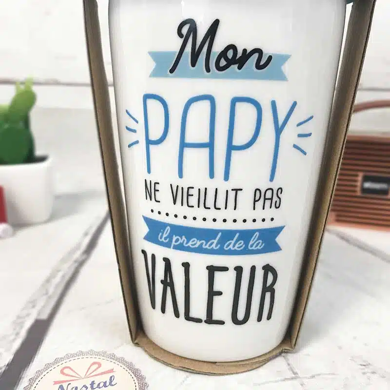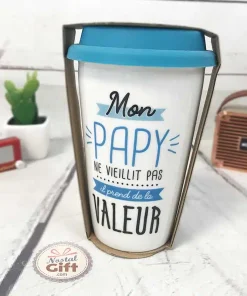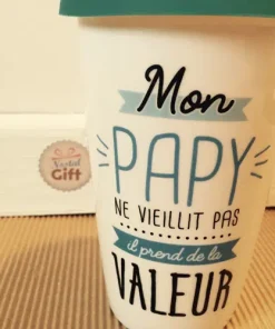 Découvrez ce mug de transport en céramique avec une double paroi pour garder le liquide au chaud et rendre hommage à votre papy en lui disant qu’il “ne vieillit pas, il prend de la valeur !!”