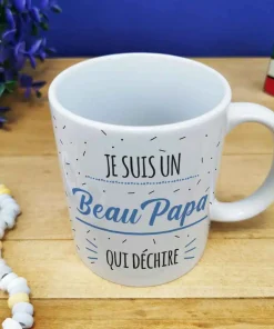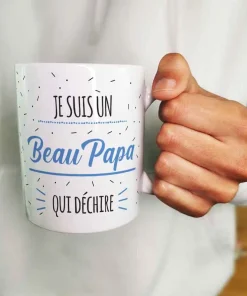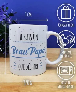 Offrez un cadeau pour beau pere qui fait plaisir pour la fête des pères ou fêter un anniversaire de votre beau père avec notre tasse. Sur ce mug il est écrit ” Je suis un Beau Papa qui déchire “sur l’avant et l’arrière de la tasse en céramique de qualité. Avec sa contenance de 320ml, cette tasse est idéale pour savourer sa boisson préférée lors de ses moments de détente.