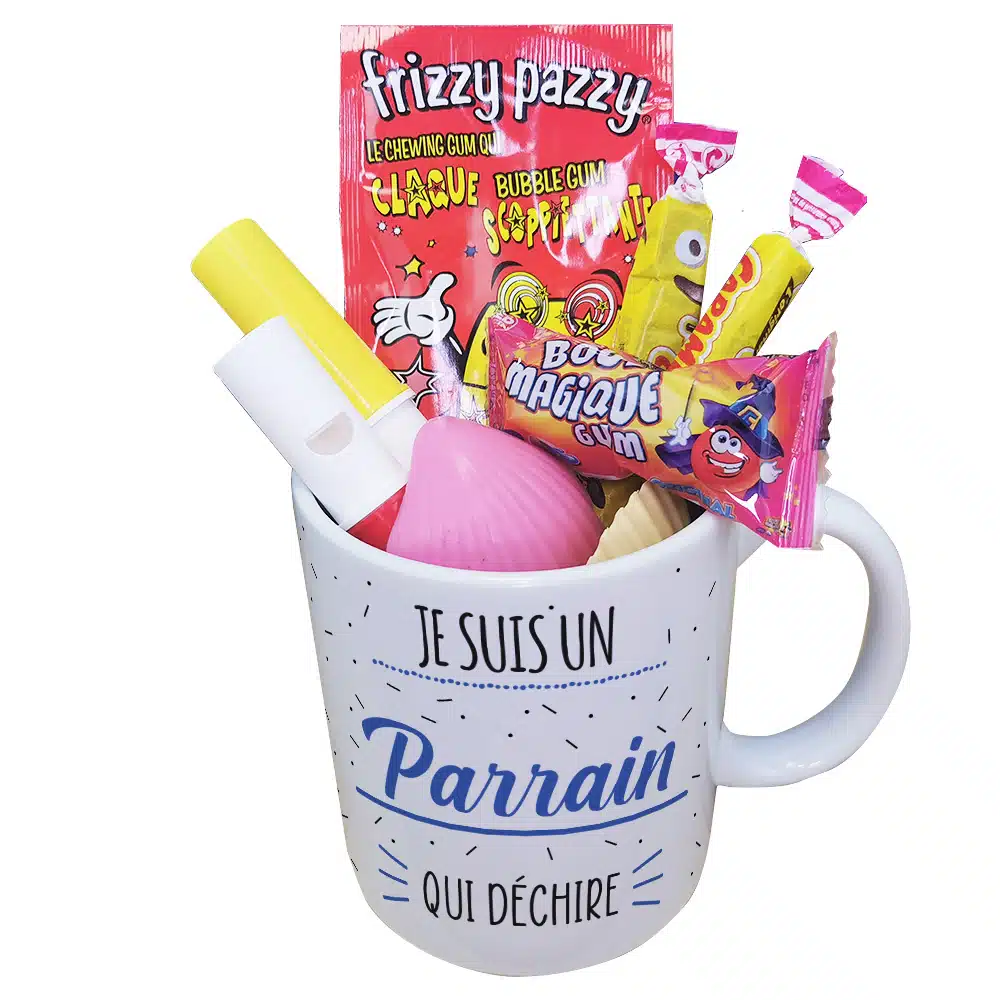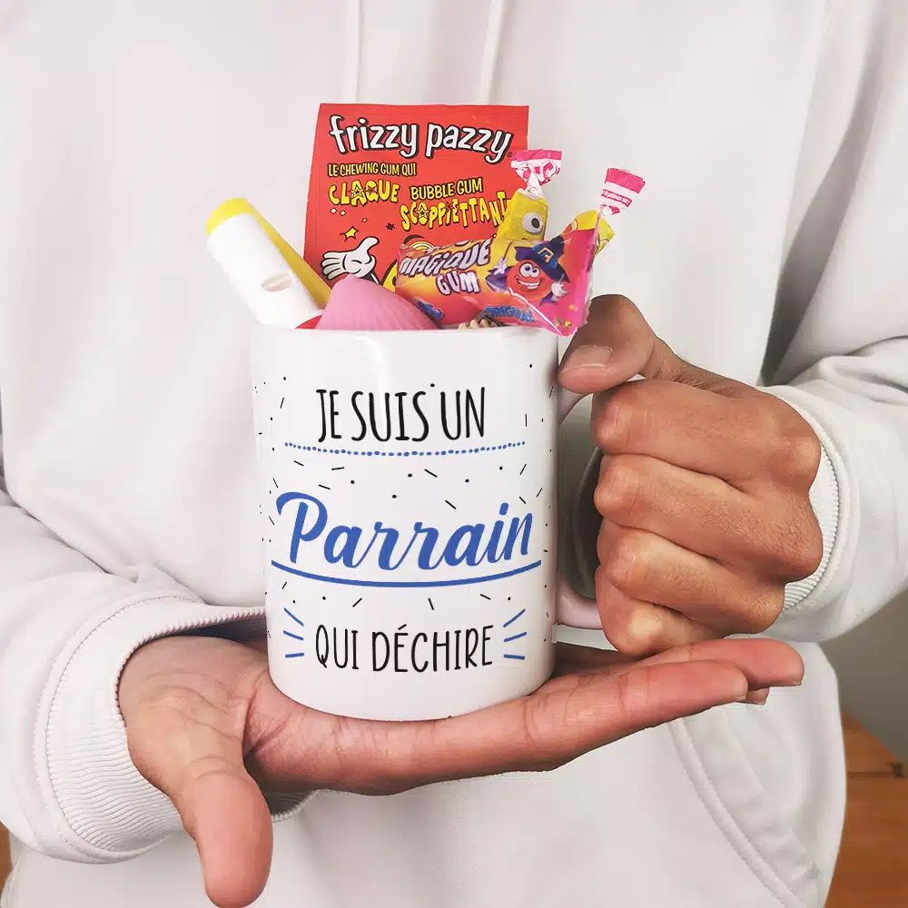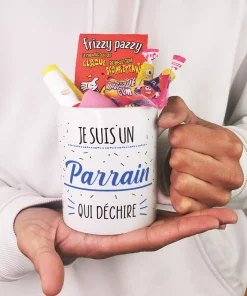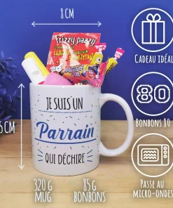 MUG “Je suis un parrain qui déchire” rempli de bonbons rétro 80 – Cadeau Parrain