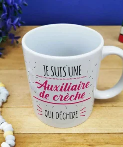 Offrez un cadeau qui dure pour l’auxiliaire de crèche pour la fin de l’année scolaire de l’Auxiliaire de crèche avec notre tasse personnalisée. Sur ce mug il est écrit ” Je suis une auxiliaire de crèche qui déchire “sur l’avant et l’arrière de la tasse en céramique de qualité. Avec sa contenance de 320ml, cette tasse est idéale pour savourer sa boisson préférée lors de ses moments de détente.