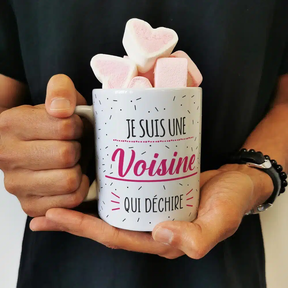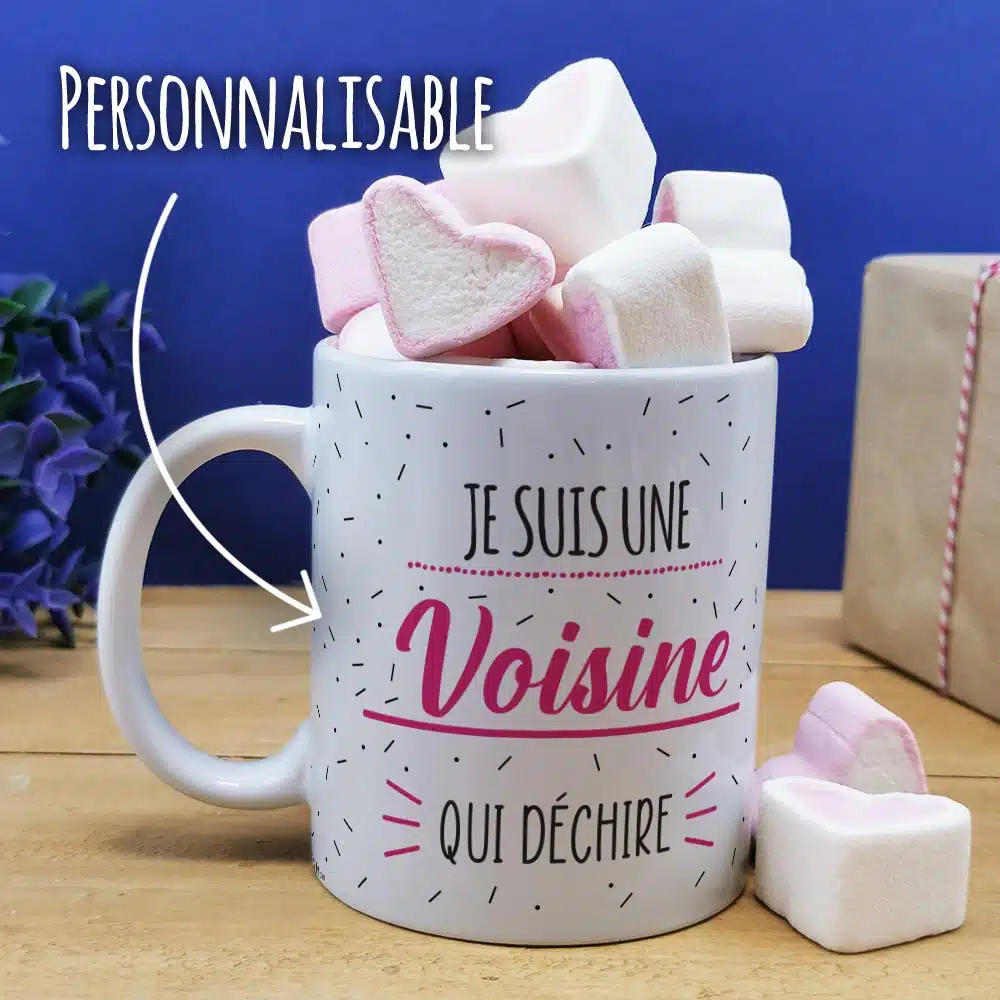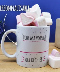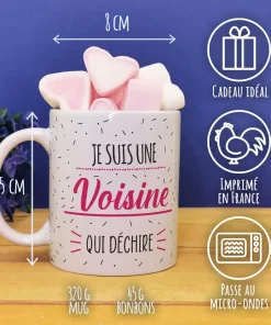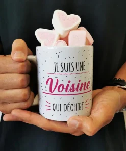 Mug “Je suis une voisine qui déchire” et ses guimauves coeurs x10 – cadeau personnalisé