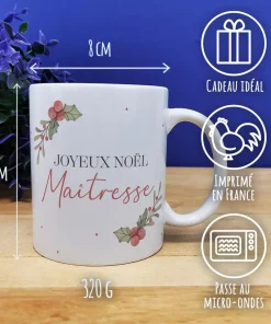 Sur ce mug, il est écrit “Joyeux Noël maîtresse “sur l’avant de la tasse avec un joli design floral de Noël. Avec sa contenance de 320ml, cette tasse est idéale pour une pause café ou un chocolat chaud lors de ses moments de détente.