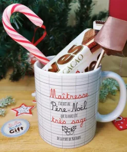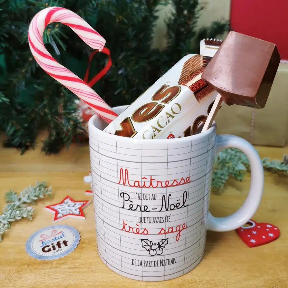 Mug “Maîtresse j’ai dit au Père Noël que tu avais été très sage” et ses chocolats rétro – – cadeau personnalisé