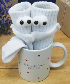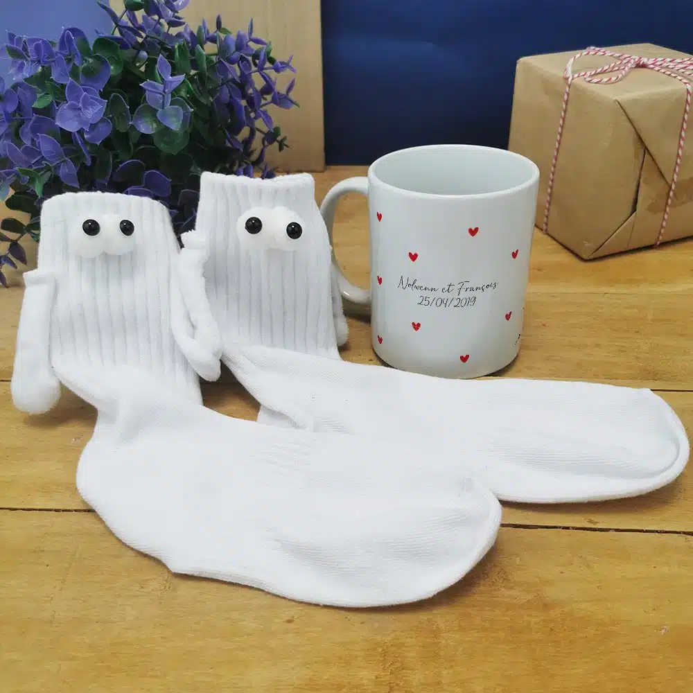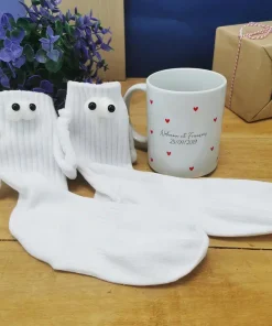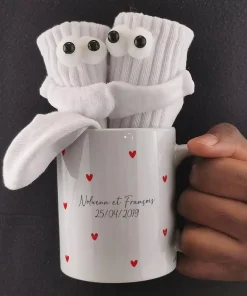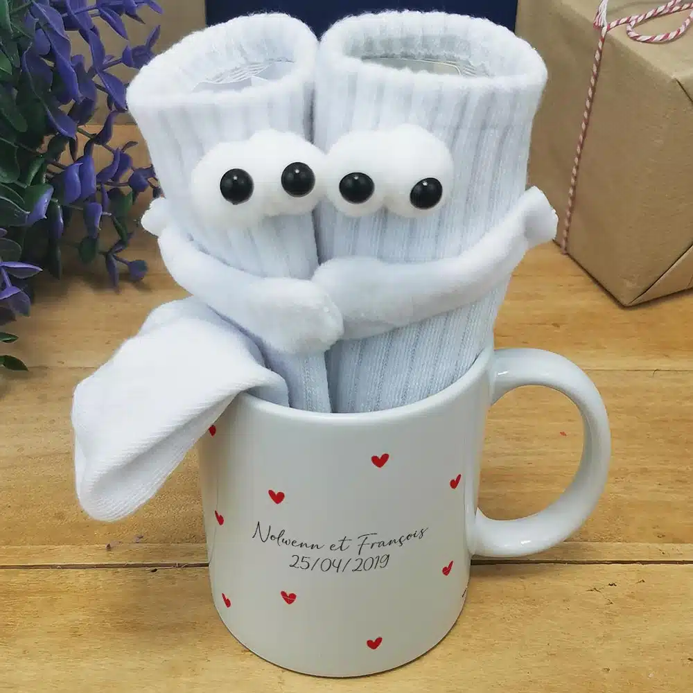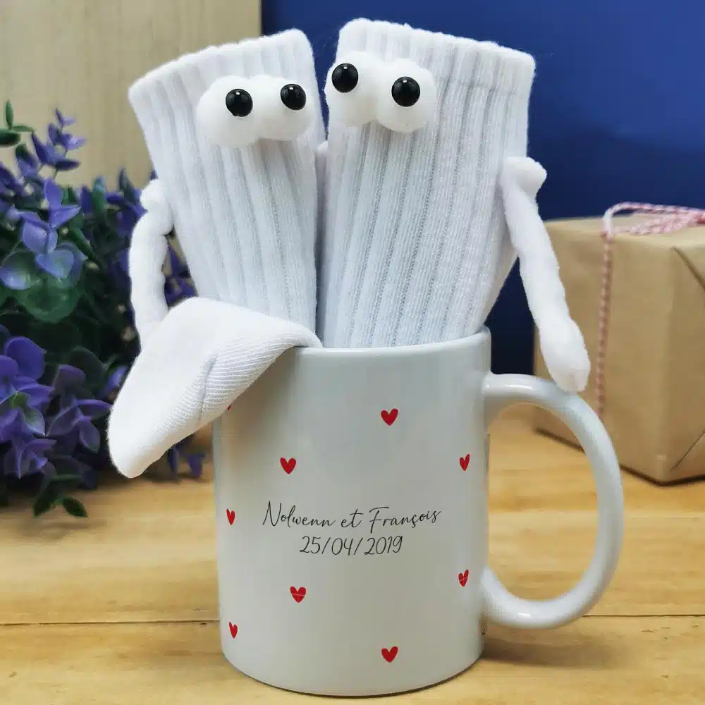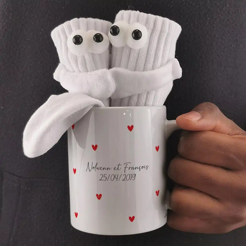 Mug “petit coeur” personnalisé (Prénom + date) et sa paire de chaussette magnétique- Cadeau pour couple