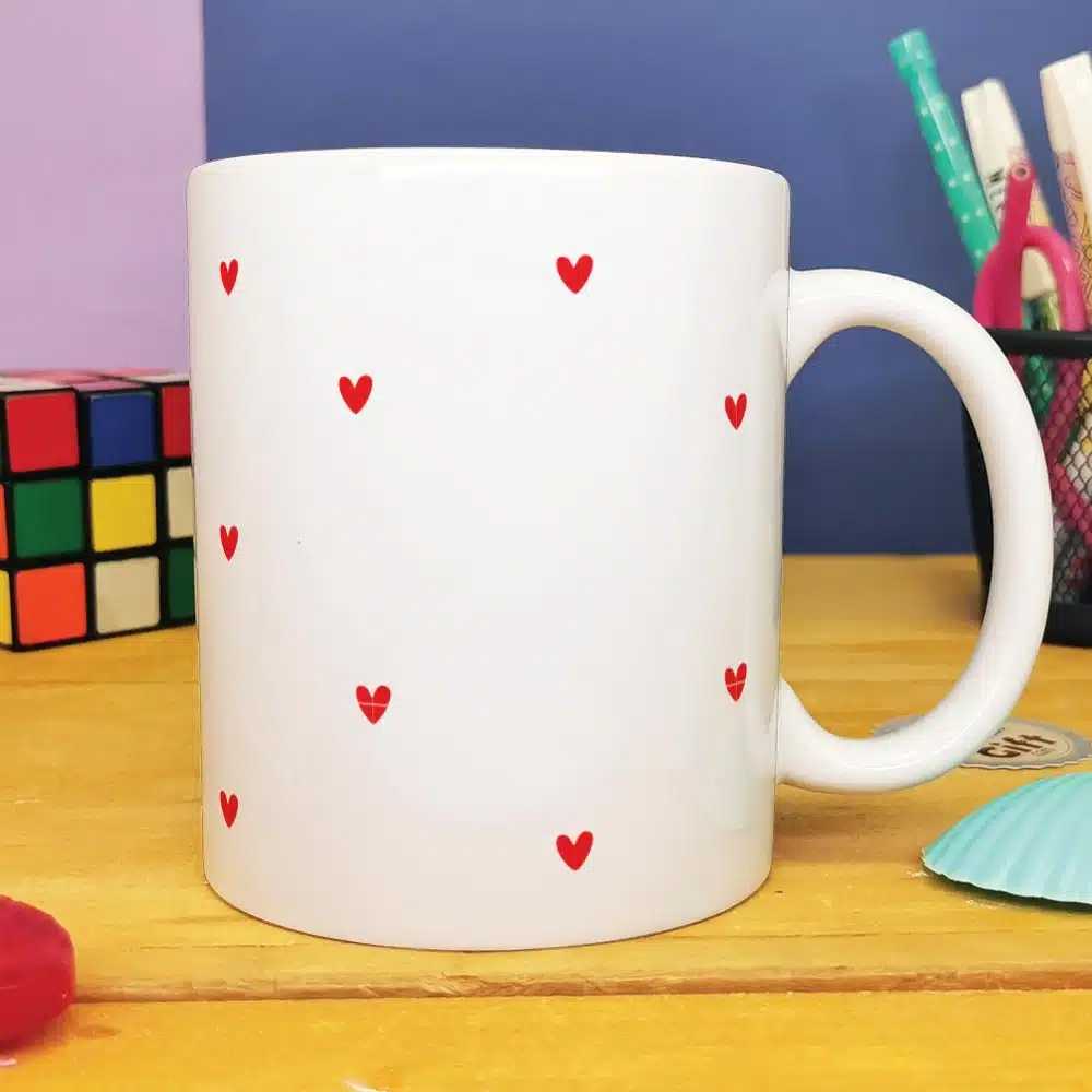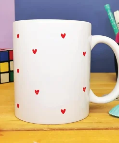 Offrez un cadeau rétro pour la Saint Valentin de votre copine ou votre copain avec notre tasse personnalisée et sa paire de chaussette magnétique. Sur ce mug, vous retrouvez plein de petits coeurs rouges, vos 2 prénoms et une date clé et une paire de chaussette blanche. Avec sa contenance de 320ml, cette tasse est idéale pour une pause café ou un chocolat chaud lors de ses moments de détente.