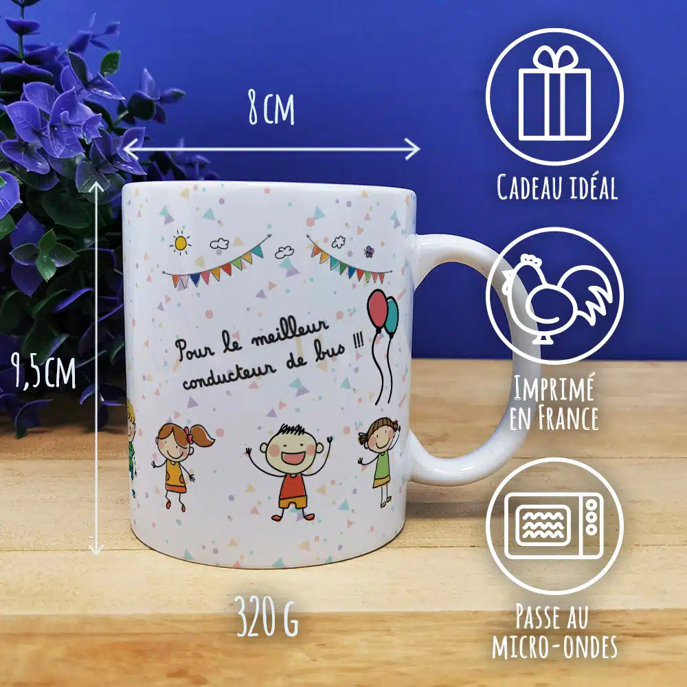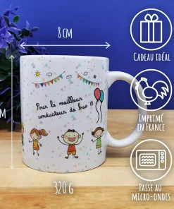 Offrez un cadeau qui durepour chauffeur de bus pour la fin de l’année scolaire de chauffeur de bus avec notre tasse, il sera parfait pour la fin de l’année scolaire . Sur ce mug, il est écrit ” Pour le meilleur conducteur de bus “sur l’avant et l’arrière de la tasse. Avec sa contenance de 320ml, cette tasse est idéale pour une pause café ou un chocolat chaud lors de ses moments de détente.