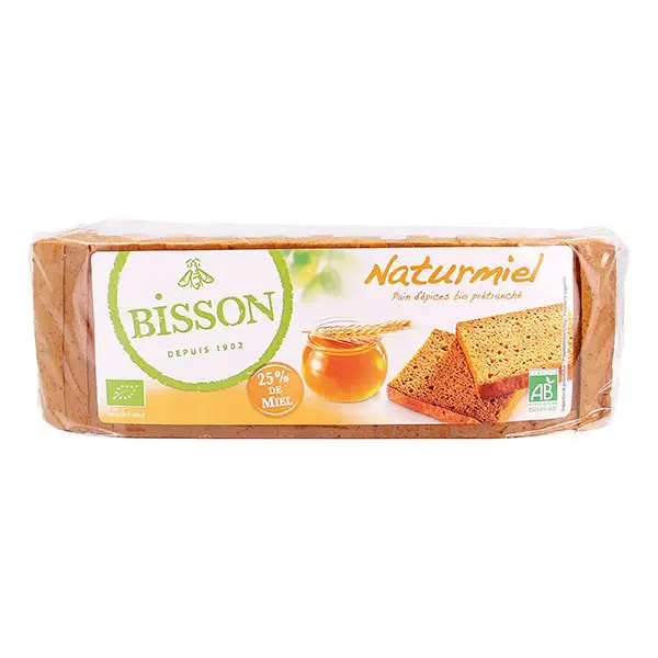Naturmiel est un pain d’épices biologique pur miel prétranché de la marque Bisson.