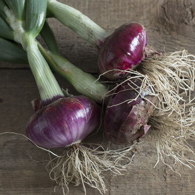 Belles ampoules rondes plates avec une riches peaux violettes. Saveur très douce avec une touche épicée. Des grappes attrayantes de 2 « de diamètre, mais peuvent également être cultivées en bulbes de 3 ». Prêt pour la récolte mi-fin mai, début juin.